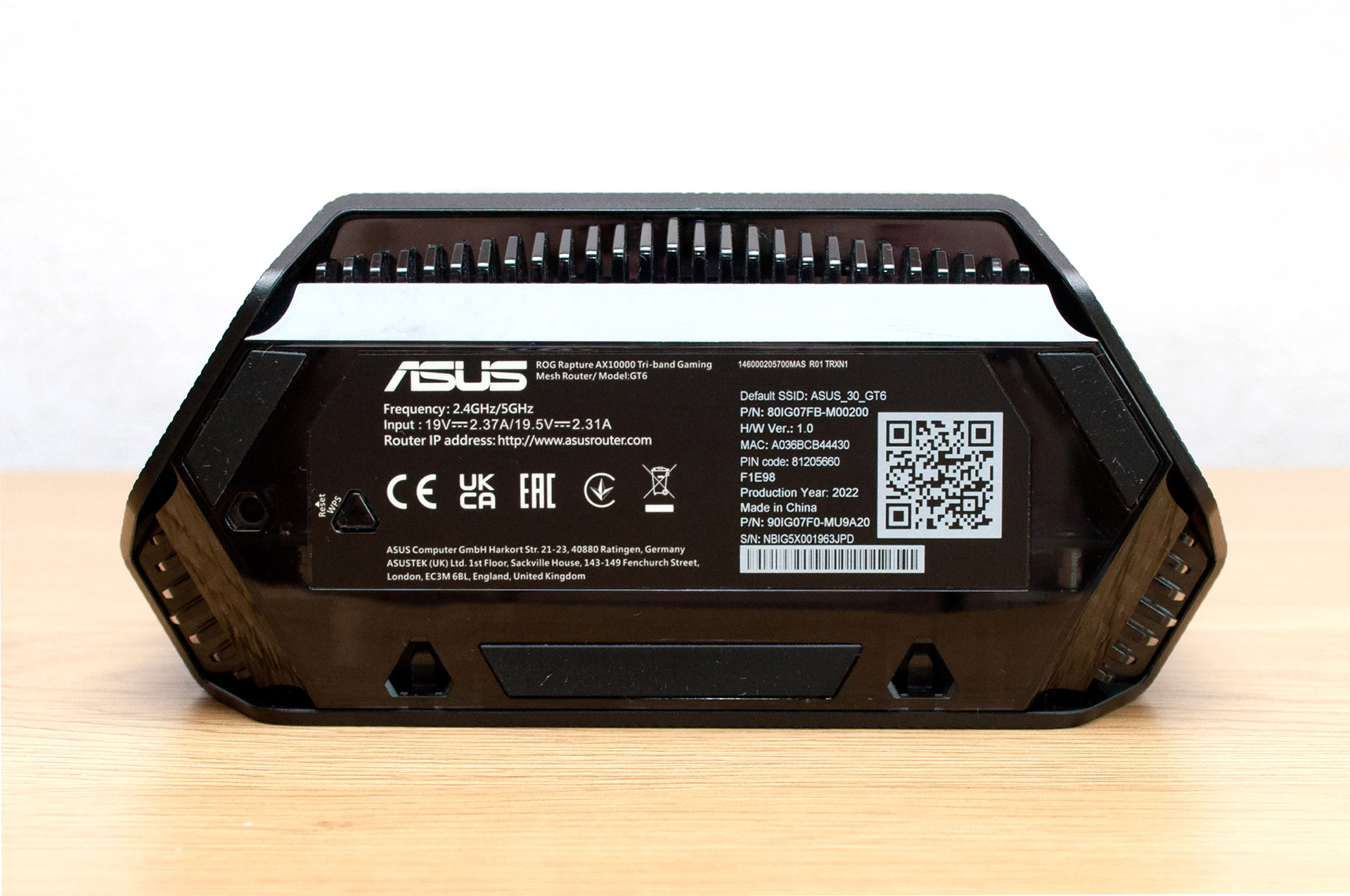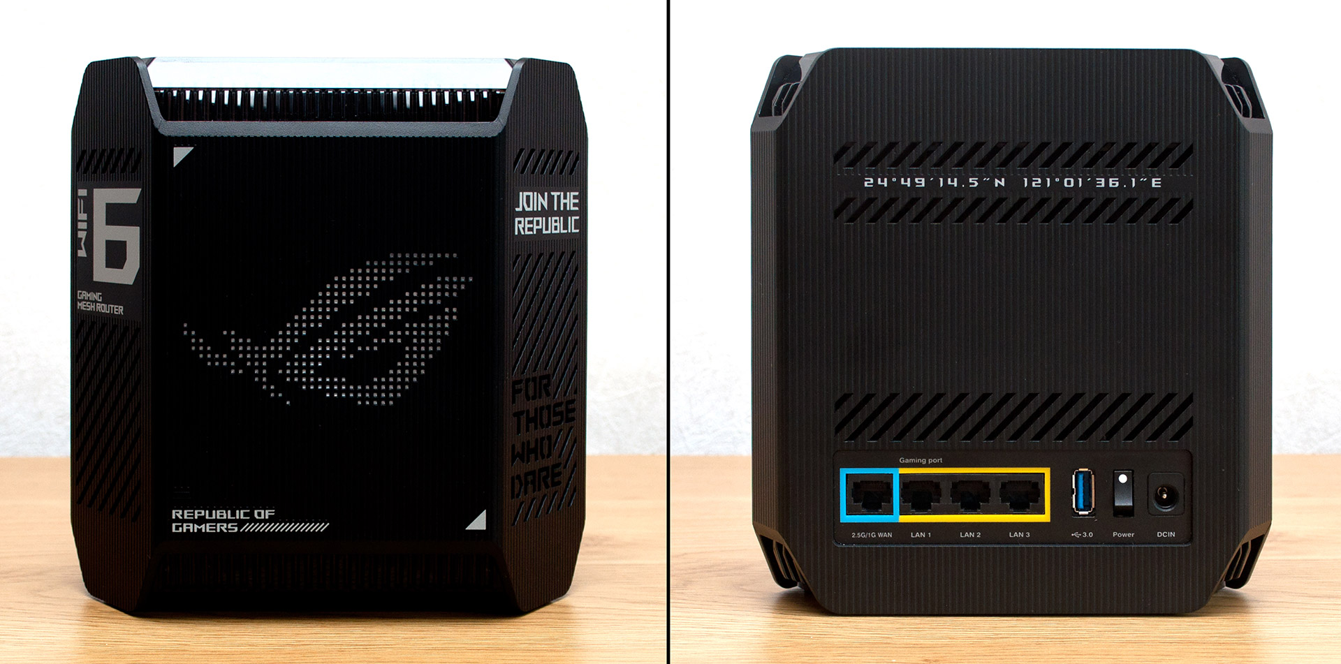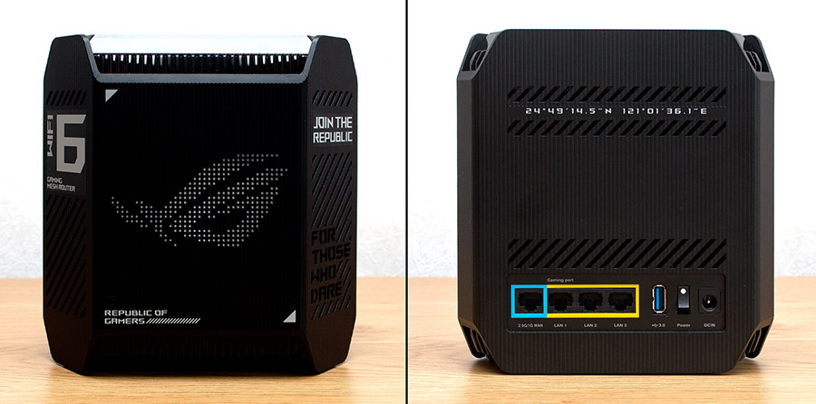 Зовнішній вигляд бездротових маршрутизаторів ASUS сімейства Republic of Gamers, що характеризується «хижим» силуетом та великою кількістю зовнішніх антен, може прийтися не до вподоби деяким з користувачів через надмірну агресивність. Пристрої серії ZenWiFi, що входять до складу AiMesh-систем, навпаки, мають максимально стриманий, навіть, утилітарний силует, що робить їх геть непомітними в інтер’єрі житлових та офісних приміщень. В цьому сенсі ASUS ROG Rapture GT6 несподівано пропонує поєднання простих геометричних форм із цікавим елементами дизайну, що підкреслюють ігрову спрямованість продукту. Оскільки обидва пристрої з комплекту постачання абсолютно ідентичні, тож знайомство з дизайном буде відбуватися на прикладі одного з них. Отже, пластиковий корпус маршрутизатора в плані має форму неправильної шестикутної призми з розмірами 175 x 80 x 175 мм і масою 885 г. Тестові екземпляри мають вугільно-чорне забарвлення, але існують ASUS ROG Rapture GT6 білого кольору. Передня панель вкрита візерунком з вертикальних борозен, її більшу частину займає логотип серії ROG, а для тих користувачів, хто сумнівається — назва серії продубльована вздовж нижньої грані. У верхній частині корпусу знаходиться прозора кришка, крізь яку видніються антени бездротових мереж та елементи системи охолодження. Тильна сторона продукту вирізняється тим, що у верхній частині між двома рядами вентиляційних отворів нанесено географічні координати 24°49’14.5”N 121°01’36.1”E, які вказують на загадкове місце, розташоване на Тайвані. Нижче знаходиться вентиляційна решітка, а під нею вишикувалися в ряд порт 2.5 Gigabit Ethernet для підключення до постачальника послуг інтернет, три інтерфейси Gigabit Ethernet у виконанні RJ-45 для клієнтів локальної мережі, роз’єм USB 3.2 Gen 1, кнопка ввімкнення живлення та гніздо для підключення зовнішнього джерела постійного струму.