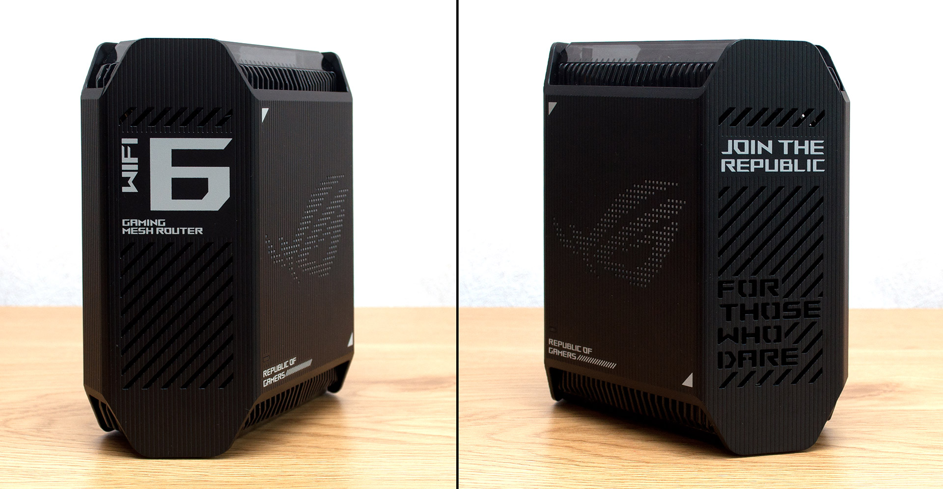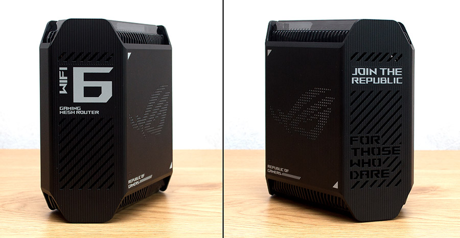 Більша частина площі бокових граней бездротового маршрутизатора вкрита вентиляційними решітками. Додатково на лівій поверхні вказано, що перед нами WiFi 6 GAMING MESH ROUTER, а на правій міститься заклик JOIN THE REPUBLIC (англ. «приєднуйся до республіки»), а додаткові вентиляційні отвори формують фразу FOR THOSE WHO DARE (англ. «для тих, хто наважиться»).