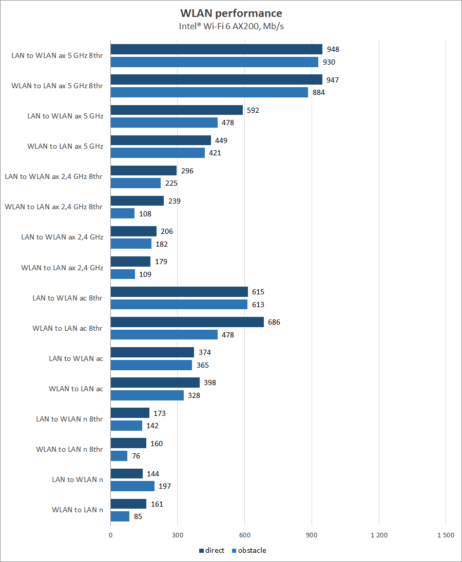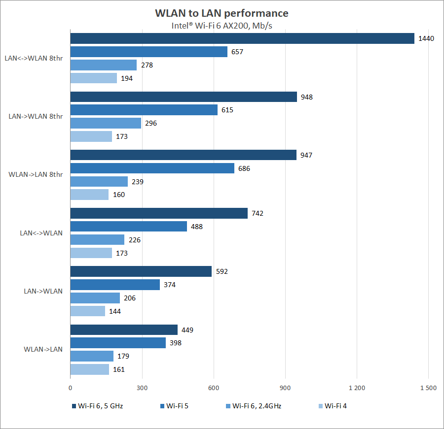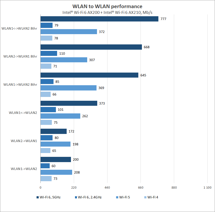 Не менше дивують результати вимірювання пропускної здатності при передачі інформації між двома бездротовими клієнтами: в режимі IEEE 802.11ax для діапазону 5 ГГц швидкість сягає 650–750 Мбіт/с, що мінімум на 40% перевищує аналогічні показники навіть флагманських моделей. Для стандарту IEEE 802.11ac показники швидкодії знаходяться на рівні від 200–260 Мбіт/с до 307–370 Мбіт/с в залежності від напрямку та кількості інформаційних потоків. На частоті 2,4 ГГц швидкість суттєво нижче, навіть в режимі IEEE 802.11ax результати не перевищують 100 Мбіт/с, а для IEEE802.11n складають від 65 до 75 Мбіт/с.