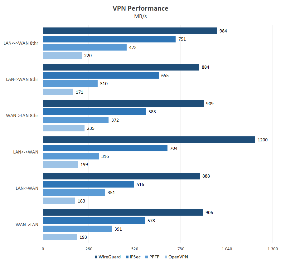 Потужна SoC забезпечує ASUS TUF Gaming AX4200 видатний рівень ефективності в якості сервера VPN, особливо при роботі з протоколом WireGuard, де швидкодія впритул наближається до 900 Мбіт/с. Використання IPSec дає дещо менші, але теж гідні результати від 500 до 750 Мбіт/с, і навіть OpenVPN демонструє середню швидкість близько 200 Мбіт/с та непогано масштабується за багатопотокової передачі даних. А справжньою несподіванкою виглядають показники PPTP на рівні 310–475 Мбіт/с, що є абсолютним рекордом серед протестованих бездротових маршрутизаторів.
