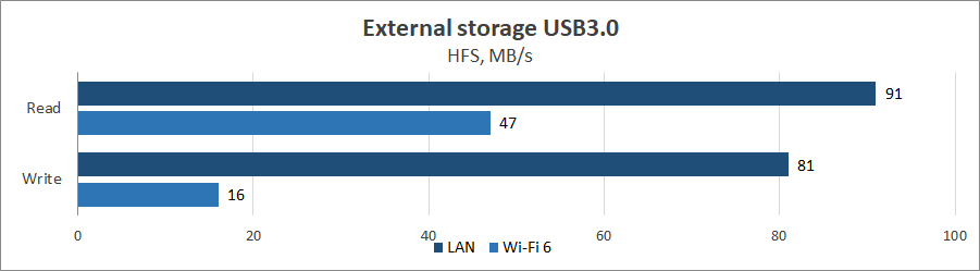 Наостанок слід зазначити роботу пристрою як мережевого накопичувача SMB в парі зі швидкісним SSD з інтерфейсом USB 3.2 Gen1. Для клієнта локальної мережі показники запису і читання складають 81 МБ/с та 91 МБ/с відповідно, тоді як з використанням Wi-Fi 6 результати дещо скромніші: від 16 МБ/с для запису до 47 МБ/с при читанні даних.