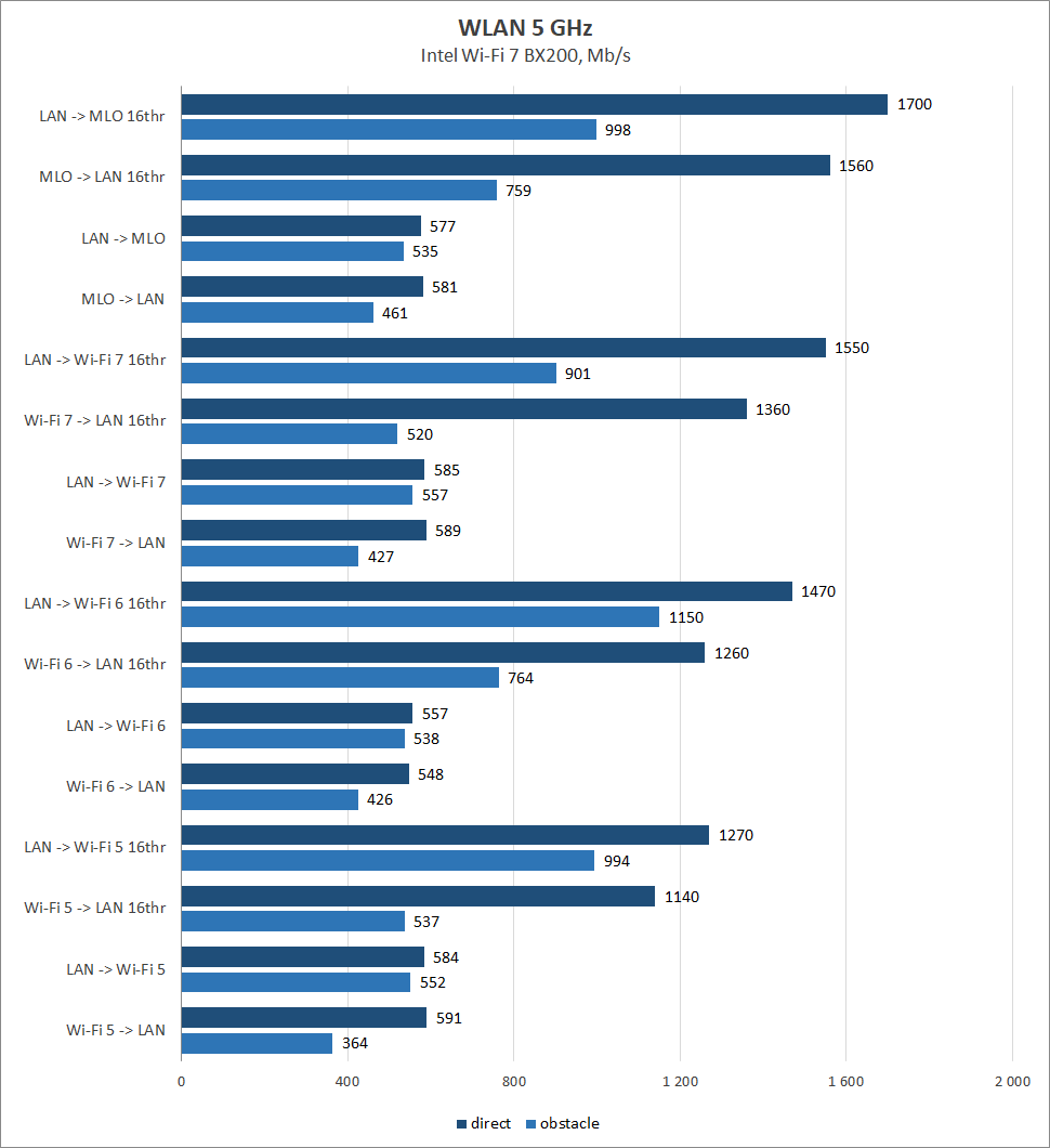 В діапазоні 5 ГГц на 100 каналі зі встановленням смуги 160 МГц швидкість передачі даних з використанням Wi-Fi 7 сягає 1360–1560 Мбіт/с при багатопотоковій передачі, тож перевага над попередником в аналогічних умовах складає менш як 10%. Агрегація смуг 2,4 ГГц та 5 ГГц в режимі MLO забезпечує приріст приблизно 10% і абсолютні показники наближаються до небачених раніше 1560–1700 Мбіт/с. На тлі цього цікаво виглядають результати стандарту Wi-Fi 5, який з каналом шириною 160 МГц демонструє пропускну здатність на рівні 1140–1270 Мбіт/с, відстаючи від Wi-Fi 6 в середньому на 10–14%. При цьому однопотокова швидкість передачі даних мало залежить від стандарту бездротових мереж і лежить в межах 550–590 Мбіт/с. Цікавіше виглядають результати, отримані в ускладнених умовах розповсюдження радіосигналу: середнє зменшення швидкодії для багатопотокової передачі даних складає 30%, але найбільше падіння — до 34% спостерігається з використанням IEEE802.11be, тоді як попередній стандарт IEEE802ax виявляється стійкішим до перешкод та забезпечує зменшення пропускної здатності лише на 22%.
