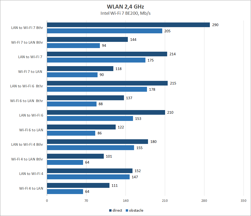 Бездротові мережі на частоті 2,4 ГГц працюють в набагато складніших умовах, оскільки в цьому діапазоні відчутний вплив сусідніх точок доступу, тож, досягти високих результатів набагато складніше. Менше з тим, при фіксації ширини каналу 40 МГц і виборі найменш завантаженої ділянки спектра в умовах прямої видимості стандарт IEEE802.11be забезпечує швидкість до 290 Мбіт/с при багатопотоковій передачі. Попередники відстають в середньому на 15% і 35% для IEEE802.11ax та IEEE802.11n відповідно, а швидкість від точки доступу до клієнта перевищує показники у зворотному напрямку майже вдвічі незалежно від стандарту. Швидкодія при передачі одного потоку даних становить від 152 Мбіт/с до 214 Мбіт/с залежно від стандарту і сильно залежить від напрямку обміну інформацією. Щодо роботи в умовах перешкод, то середнє зменшення пропускної здатності знаходиться на рівні 26% і мало залежить від покоління стандарту Wi-Fi.