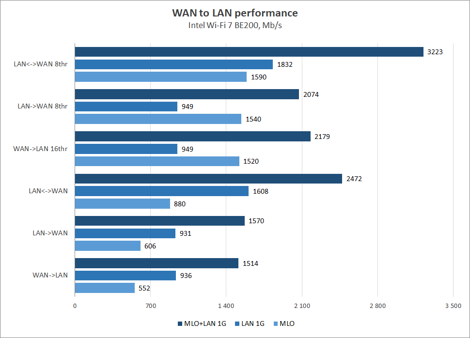 На практиці, при одночасній роботі клієнтів, під’єднаних до порту Gigabit Ethernet та бездротової мережі Wi-Fi 7 в режимі MLO, швидкість перевищила 2000 Мбіт/с при передачі 16 потоків інформації, тоді як при роботі в обох напрямках пропускна здатність сягнула 3200 Мбіт/с. Кожний з клієнтів LAN і WLAN окремо досягли практичних меж технологій передачі, отже, TUF Gaming BE3600 не буде стримувати потенціал широкосмугового підключення до мережі Інтернет.