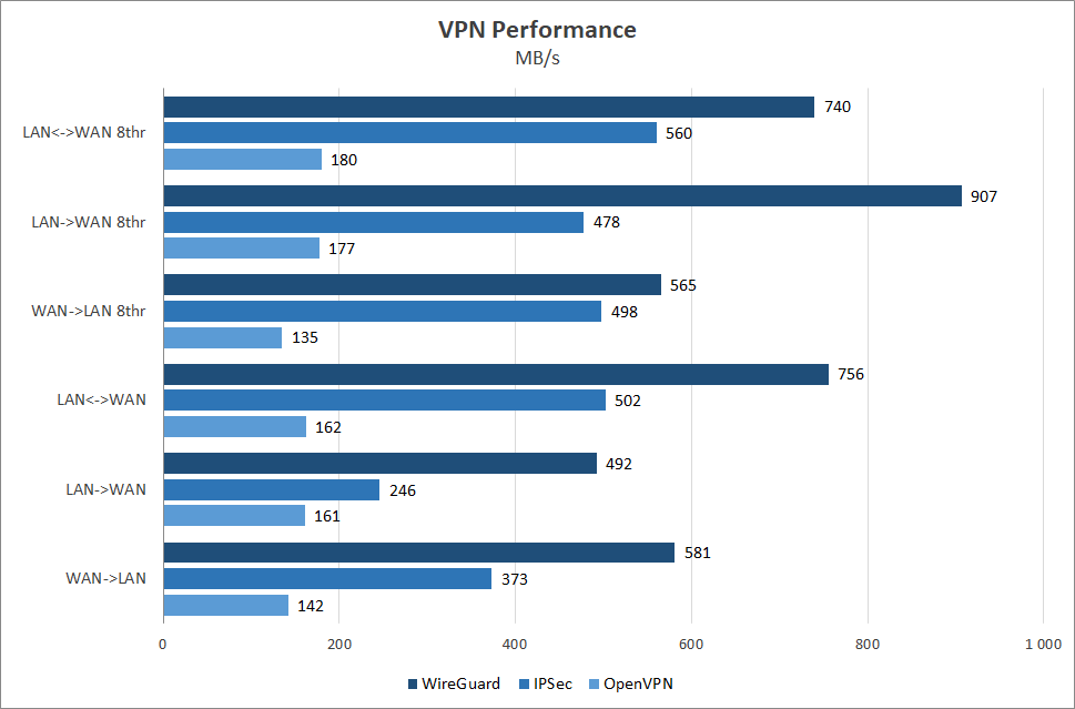 Щодо здатності бездротового маршрутизатора працювати як сервер VPN, то найкращі результати — до 900 Мбіт/с досягаються для протоколу WireGuard, тоді як використання IPSec забезпечує пропускну здатність на рівні 500 Мбіт/с, а для популярного стандарту OpenVPN швидкість передачі даних коливається в межах 140–180 Мбіт/с.