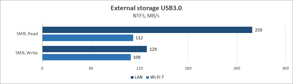 Врешті-решт, ASUS TUF Gaming BE3600 добре себе зарекомендував як мережеве сховище із підключеним твердотілим накопичувачем з інтерфейсом USB 3.2 Gen 1. Для клієнтів LAN швидкості запису і читання становлять 129 МБ/с і 259 МБ/с відповідно, тоді як при перемиканні на бездротову мережу Wi-Fi 7 в режимі MLO показники зменшуються до 109–112 МБ/с, що можна вважати відмінними результатами для продукту середнього цінового діапазону.
