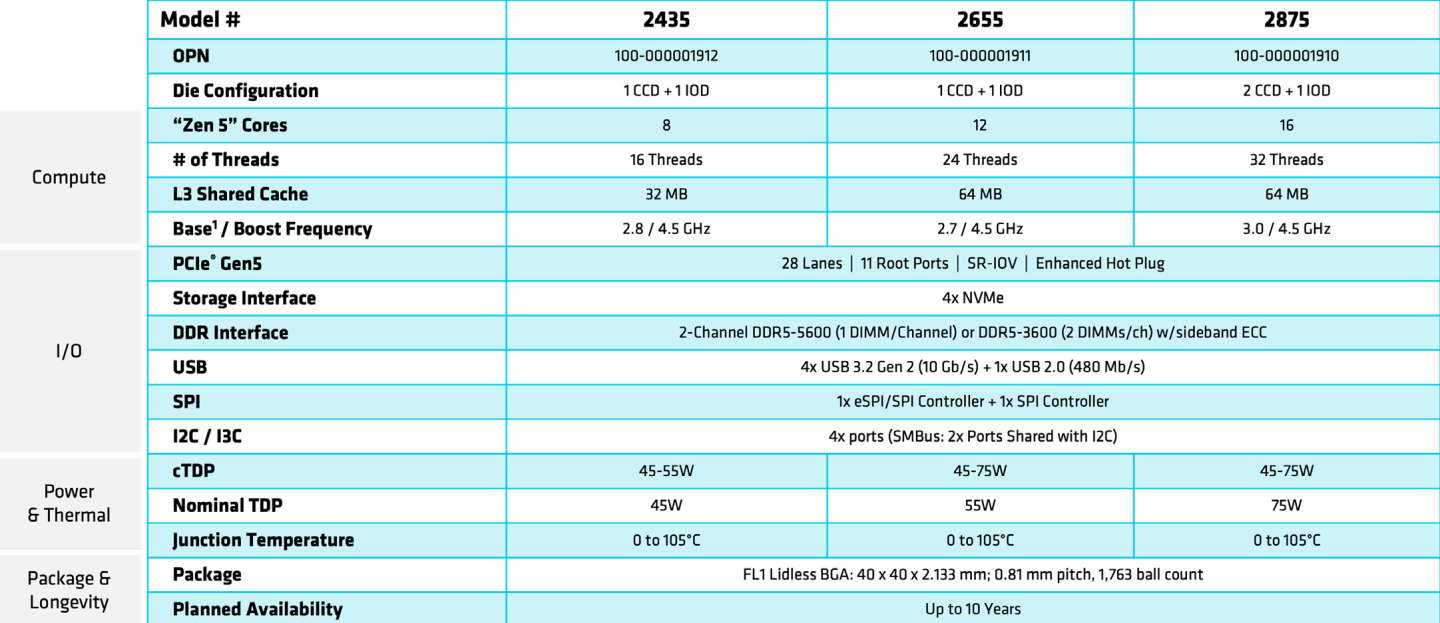 З погляду технічних характеристик процесори AMD EPYC Embedded 2005 мало відрізняються від серії Ryzen 9000HX (Fire Range) для ігрових ноутбуків. Вони теж мають BGA-виконання, можуть запропонувати до 16 ядер Zen 5, до 64 МБ кешу третього рівня, підтримують оперативну пам’ять DDR5-5600 і оснащені контролером PCI Express 5.0 на 28 ліній. Всього AMD представила три моделі, зі специфікаціями яких можна ознайомитися нижче.
