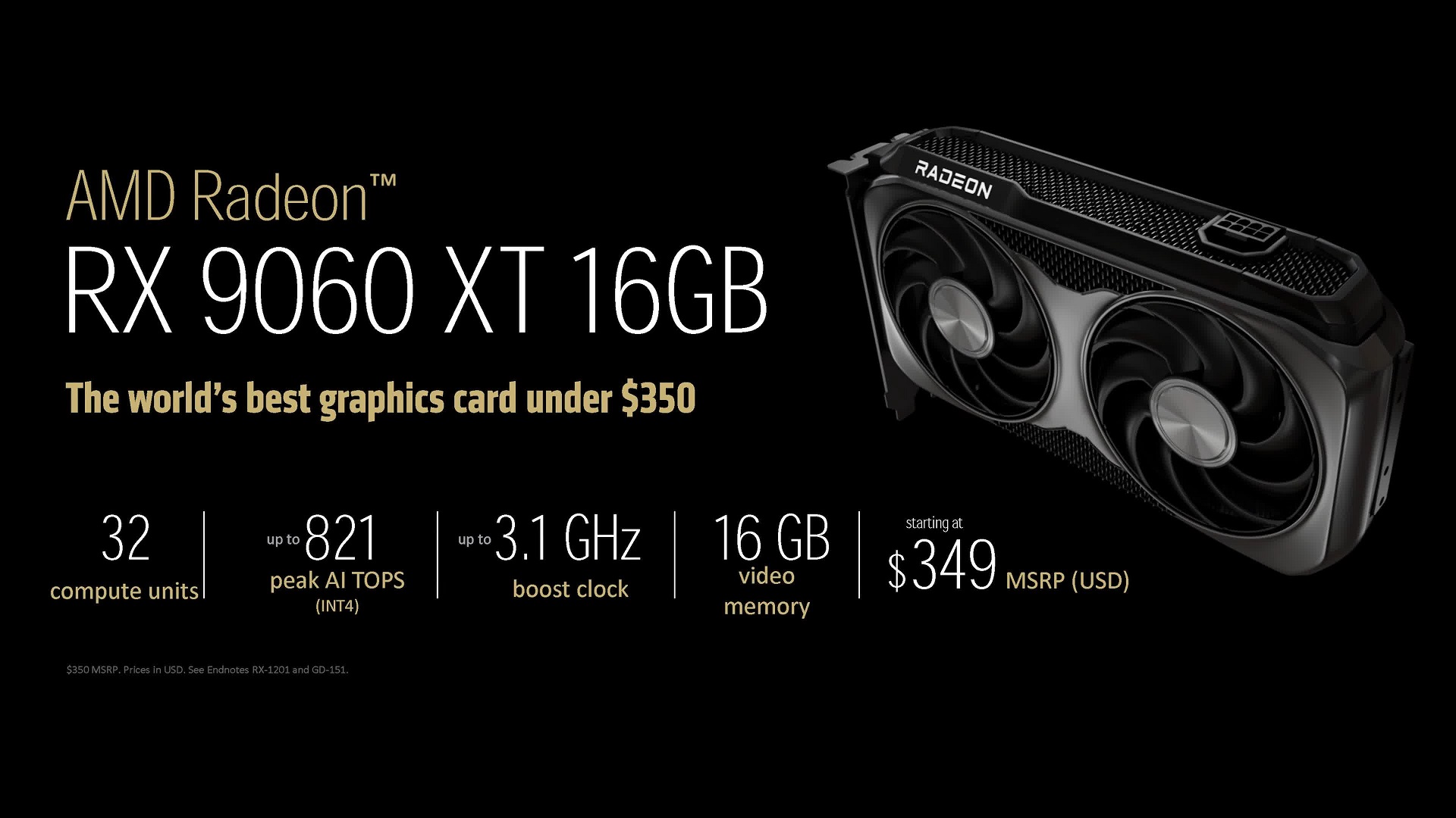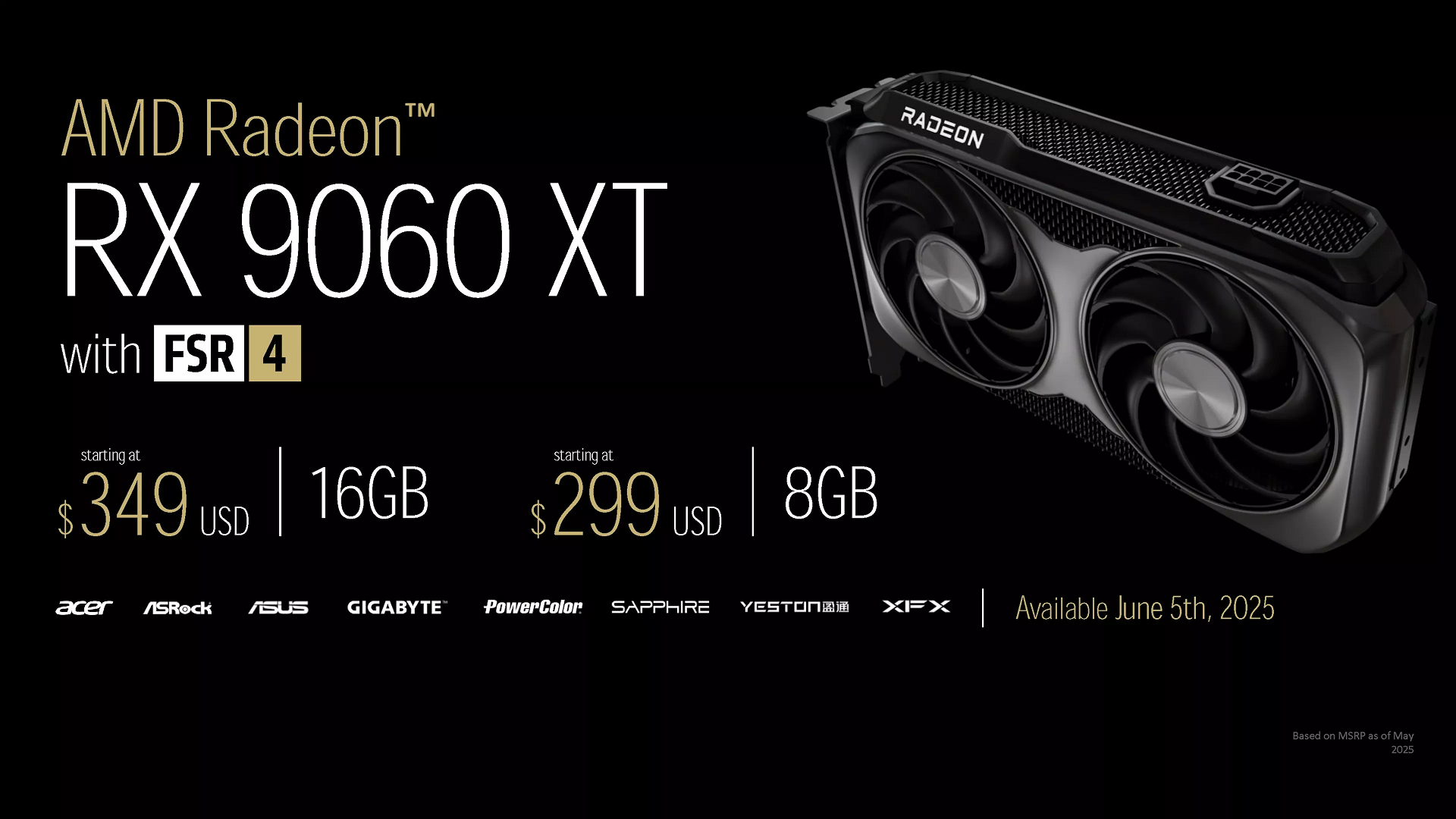 Офіційний старт продажів Radeon RX 9060 XT заплановано на п’яте червня. Рекомендована ціна відеокарти складе від $299 та $349 доларів за версії із 8 та 16 ГБ пам’яті відповідно.