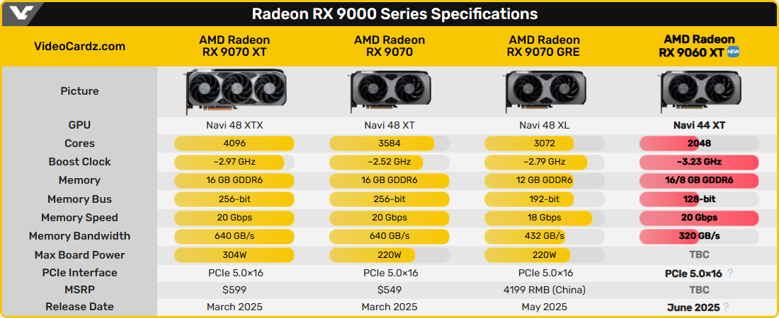 Повідомляється, що параметр Boost Clock у відеокарт Radeon RX 9060 XT сягатиме 3320 МГц, а частота Game Clock складе до 2780 МГц. Це найбільші показники серед усіх відеокарт AMD RDNA 4‑го покоління. Для порівняння, еталонна частотна формула Radeon RX 9070 має вигляд 2070/2520 МГц (Game/Boost Clock), а Radeon RX 9070 XT функціонує на 2400/2970 МГц.