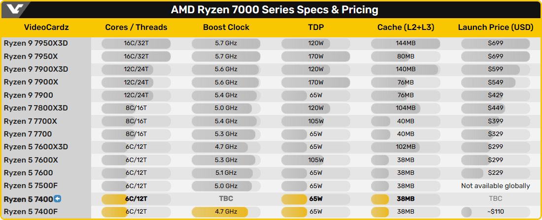 Точні специфікації AMD Ryzen 5 7400 на цей час залишаються невідомі, хіба що, вказується 65-ватний рівень TDP. Можна припустити, що перед нами ще один 6‑ядерник Zen 4 із 32 мегабайтами L3-кешу, а його головною відмінністю від випущеного цієї зими процесора Ryzen 5 7400F стане наявність вбудованої графіки. Використовувати новинку можна буде з материнськими платами AM5 на чипсетах 600‑ї та 800‑ї серії (за умови оновлення UEFI).