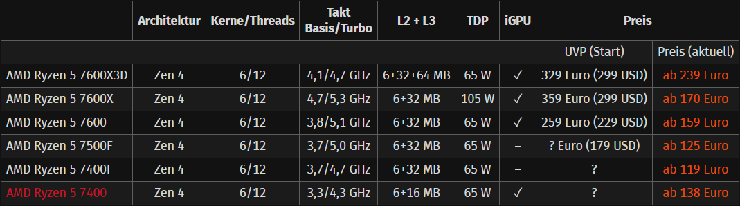 Також варто відзначити досить високу ціну, як для найменш продуктивного 6‑ядерника платформи AMD AM5. В європейських магазинах AMD Ryzen 5 7400 наразі можна придбати за ціною від €138, тоді як Ryzen 5 7400F та Ryzen 5 7500F обійдуться у 119 та 125 євро відповідно.