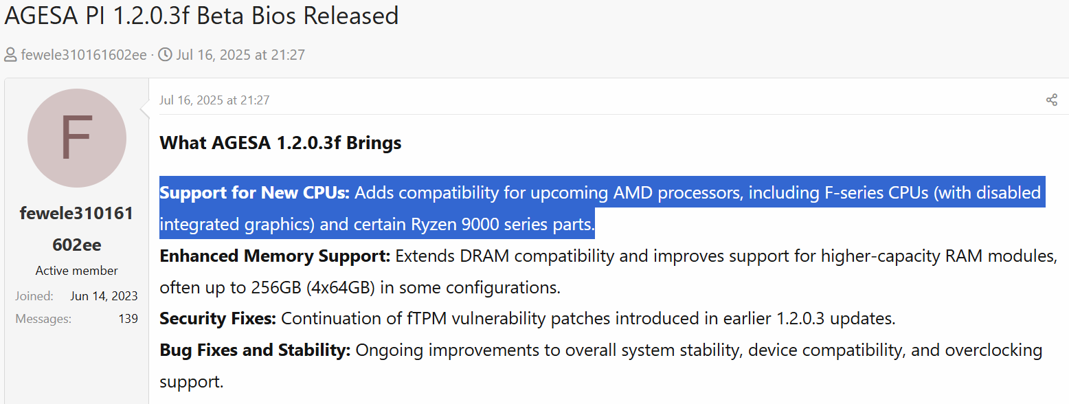 Зокрема, компанія MSI оприлюднила бета-версії прошивок на базі AGESA 1.2.0.3f для більшості системних плат на чипсетах X870 та B850. Крім загальних поліпшень стабільності та виправлень безпеки вони принесли покращену підтримку 64-гігабайтних модулів пам’яті та забезпечують сумісність із майбутніми процесорами AMD, включно із новими чипами F‑серії та деякими іншими.