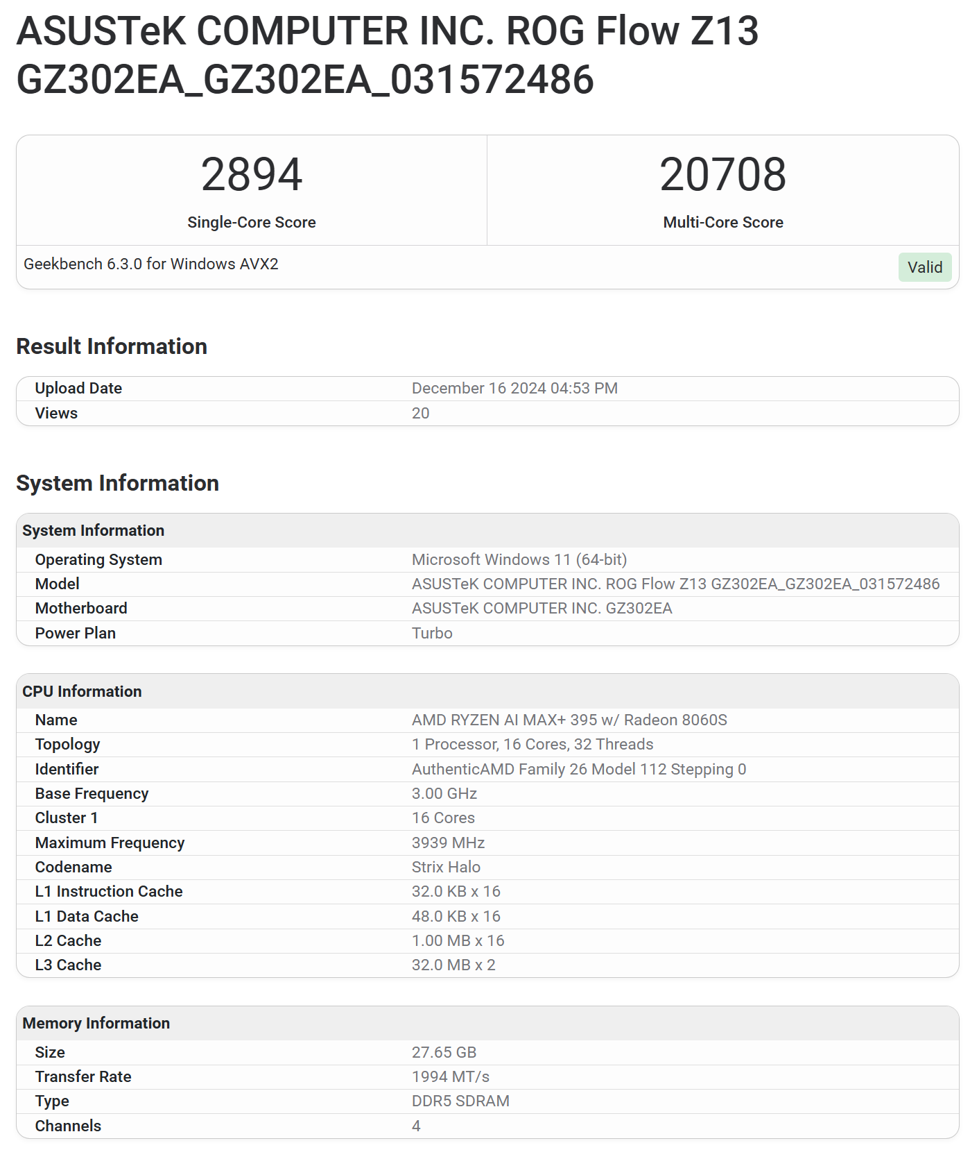 Бенчмарк Geekbench 6.3.0 вищезгаданий процесор завершив з досить непоганим результатом — 2894/20708 балів (Single-/Multi-Core). Це, наприклад, більше, ніж набирають Ryzen 9 7945HX (2736/15896 балів) та Ryzen 9 7945HX3D (2736/15896 балів) з технологією 3D V-Cache. Щоправда, ці CPU виконані на архітектурі Zen 4, тоді як новинка базується на Zen 5.