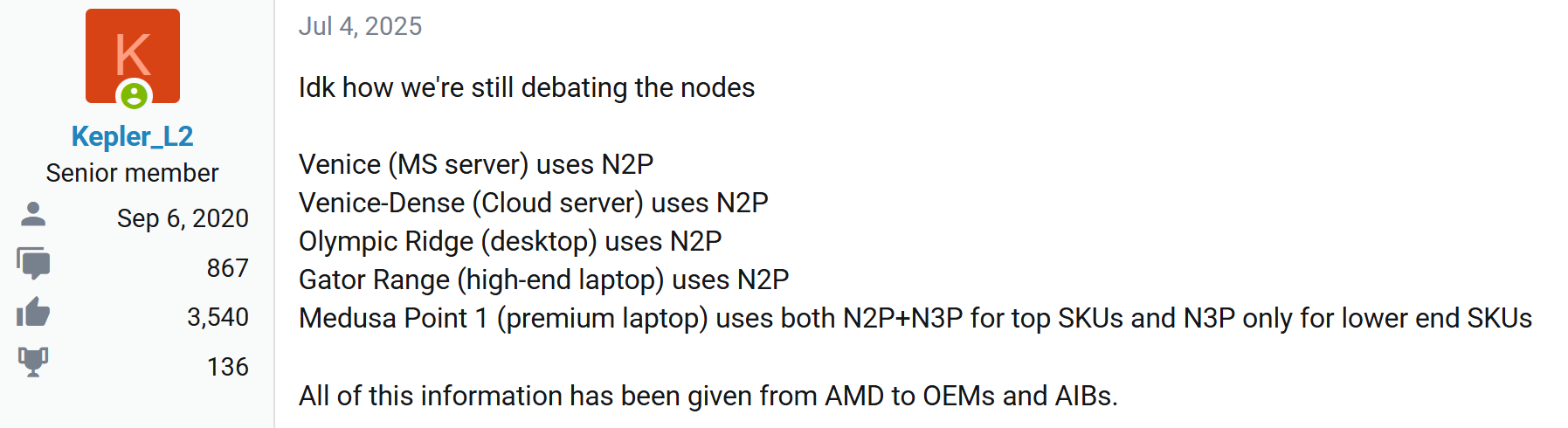 Повідомляється, що більшість процесорів AMD Zen 6 виготовлятимуть за технологією TSMC N2P. Йдеться про серверні Venise, включно з версією Venice Dense з великою кількістю ядер, десктопні Olympic Ridge та чипи Gator Range для топових ігрових ноутбуків. Тут, судячи з усього, маються на увазі самі чиплети з x86-ядрами. Мікросхеми вводу-виводу, ймовірно, будуть виготовлятися за іншими технологічними нормами.