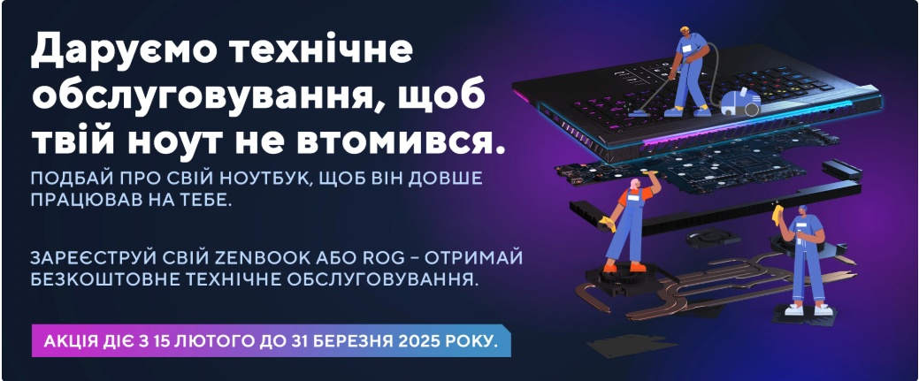 Акція «Даруємо ТО, щоб твій ноут не втомився» надає новим зареєстрованим користувачам ноутбуків ASUS лінійки Zenbook і ноутбуків бренду ROG можливість безкоштовно пройти комплексне технічне обслуговування своїх пристроїв.