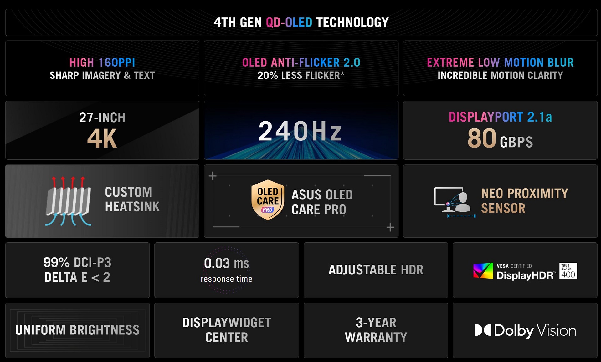 Серед інших особливостей ROG Swift OLED PG27UCDM виробник виділяє пікову яскравість 1000 кд/м², час відгуку 0,03 мс (від сірого до сірого), 99% охоплення колірної палітри DCI-P3, показник Delta E<2 та фірмову технологію ROG OLED Anti-Flicker 2.0 для зменшення мерехтіння екрана. Є підтримка AMD FreeSync Premium Pro з відповідністю вимогам G-Sync Compatible, сертифікат DisplayHDR 400 True Black і трирічна гарантія виробника.