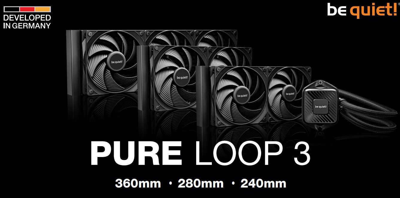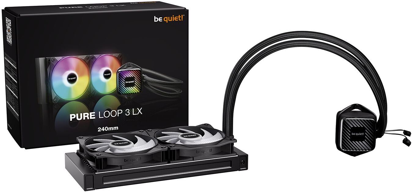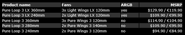 У системах рідинного охолодження be quiet! Pure Loop 3 використовується водоблок із мідною контактною пластиною і вбудованою помпою, шланги в обплетенні та алюмінієві радіатори завтовшки 27 мм. Їх обдув забезпечують 120-/140-мм вентилятори Pure Wings 3 або Light Wings LX у версій з ARGB-підсвічуванням. З інших особливостей можна відзначити отвір для дозаправки контуру СВО.