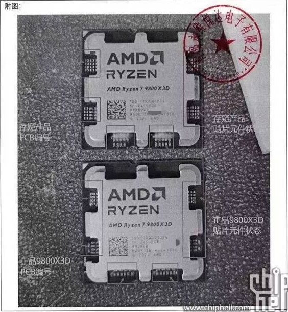На поточний момент поширення підроблених Ryzen 7 9800X3D не набуло масового характеру, однак тим, хто розглядає купівлю цього процесора, слід бути обережними. Відрізнити підробку можна, наприклад, за елементами на друкованій платі. Фальшиві Ryzen 7 9800X3D успадкували її від чипів серії Ryzen 7000, тому їх видає відсутність або неправильне розташування конденсаторів, які видно у вирізах теплорозподільної кришки.