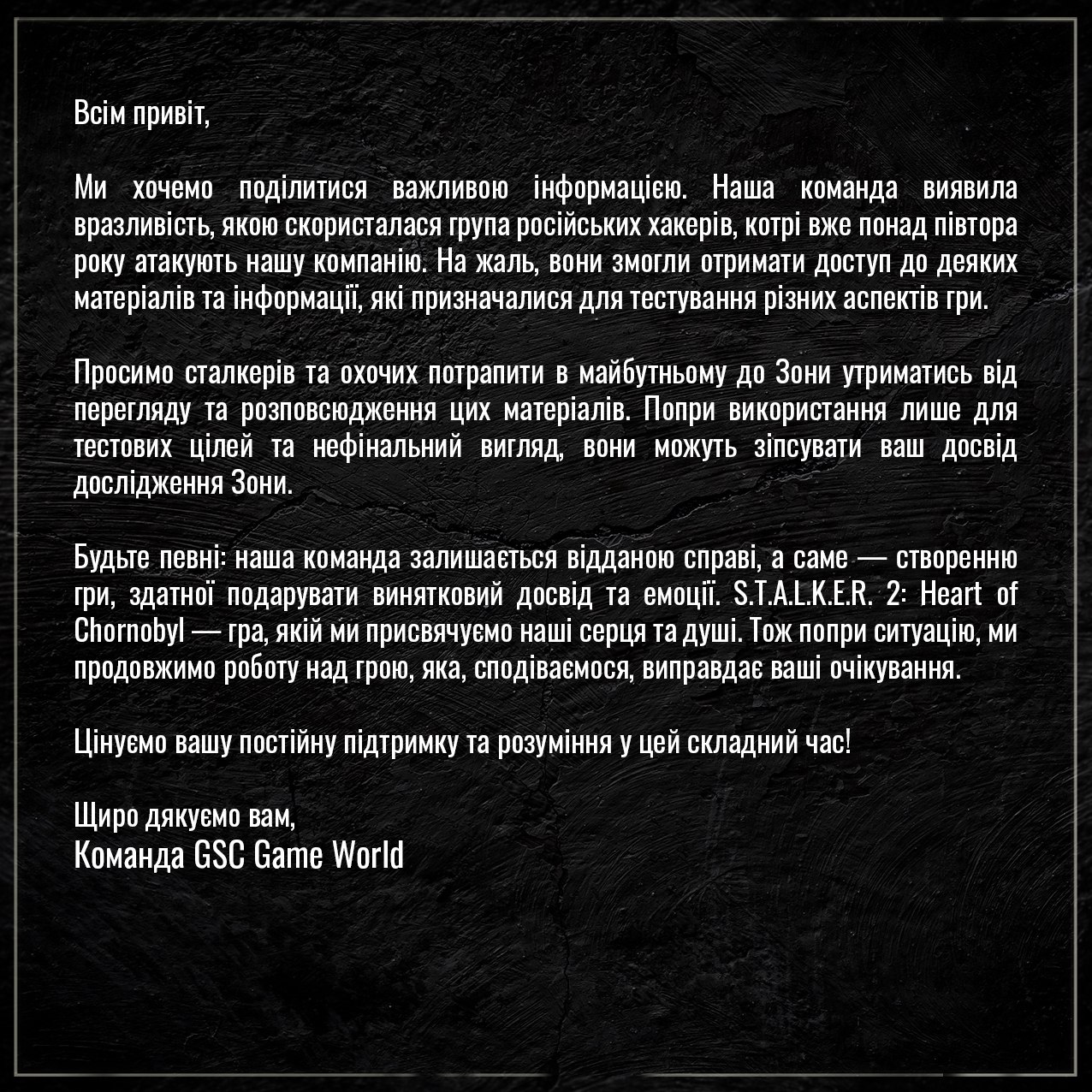 Продовжується протистояння GSC Game World із російськими хакерами. Днями у мережу нібито виклали ранній білд гри S.T.A.L.K.E.R. 2: Heart of Chornobyl об'ємом 200 ГБ. Файли були зашифровані, але пароль вже підібрано. Все це змусило GSC Game World виступити з офіційною заявою.