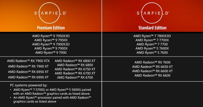 Для гри в 4K AMD рекомендує систему на базі процесора Ryzen 7 7800X3D і відеокарти Radeon RX 7900 XT. У випадку 1440p впорається комп'ютер з Ryzen 7 7700X та Radeon RX 6800, а для 1080p буде достатньо чипа Ryzen 5 7600 й графіки Radeon RX 7600. Це трохи відрізняється від офіційних системних вимог, втім, ні Bethesda, ні AMD не вказують орієнтовну частоту кадрів.
