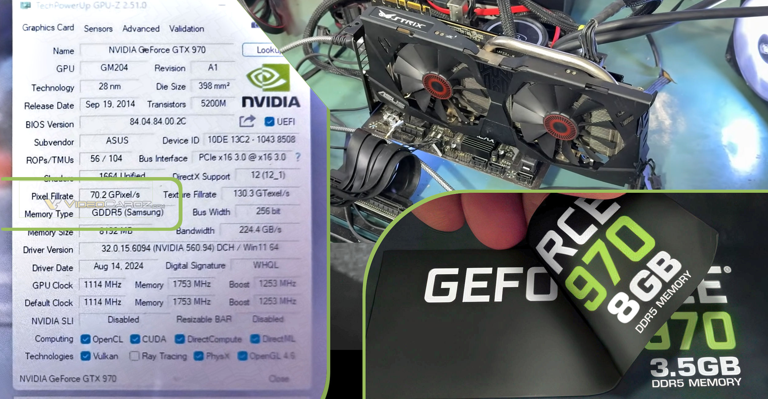 Бразильські ентузіасти продовжують експериментувати зі збільшенням обсягу пам’яті на відеокартах AMD і Nvidia. Цього разу в ролі піддослідного кролика виступила GeForce RTX 970. Цей 3D-прискорювач свого часу наробив чимало галасу через проблеми з пропускною здатністю відеопам’яті. На повній швидкості працювало тільки 3,5 ГБ, про що Nvidia не згадала під час презентації, і надалі «зелені» погодилися виплатити по $30 незадоволеним власникам GeForce GTX 970.