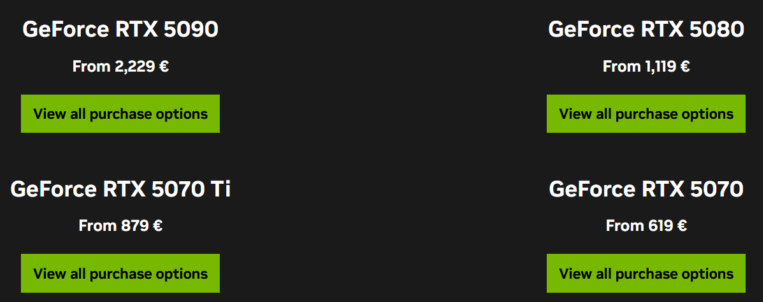 Наразі Nvidia пропонує придбати GeForce RTX 5090 за 2229 євро (було €2329), GeForce RTX 5080 подешевшала з 1169 до 1119 євро, модель GeForce RTX 5070 Ti зберегла стару ціну (€879), а GeForce RTX 5070 тепер оцінюється в 619 євро (замість €649). На жаль, у наявності моделей за такими цінами знайти не вдасться, а доступні варіанти від AIB-партнерів Nvidia обійдуться помітно дорожче.