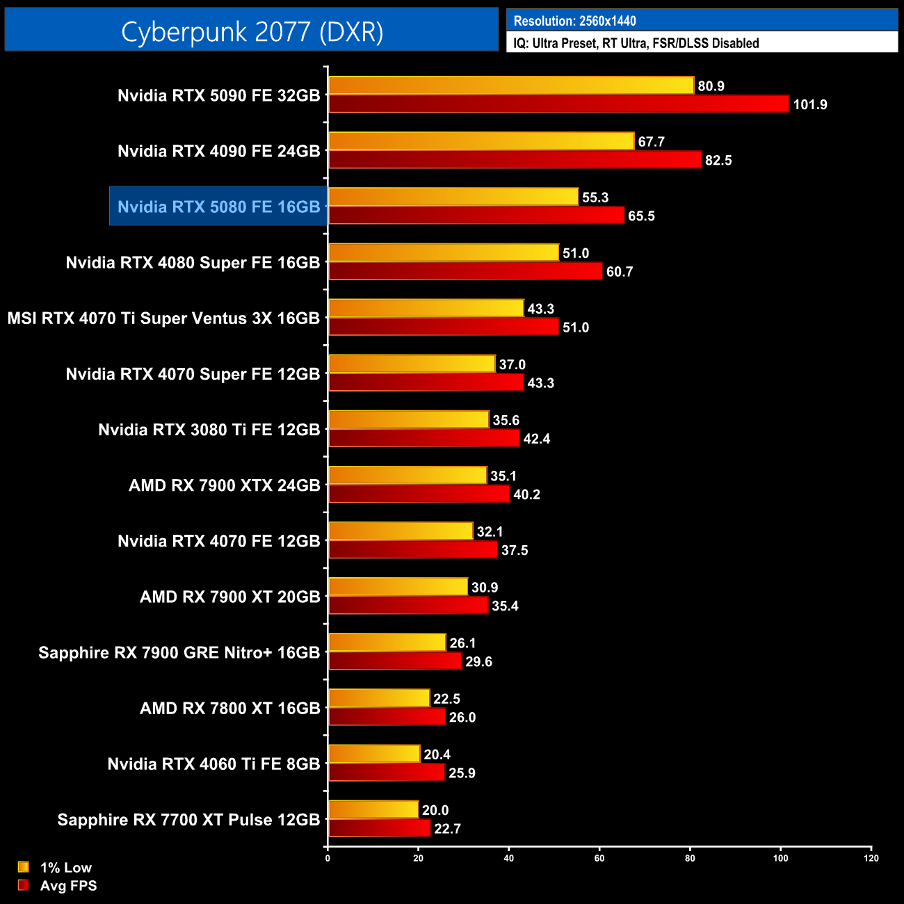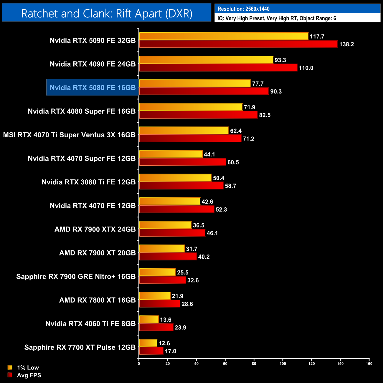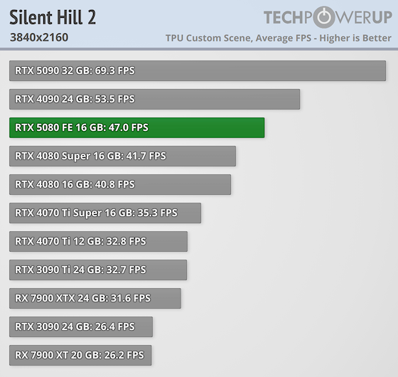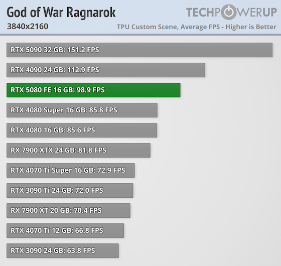 Рівень ігрової продуктивності GeForce RTX 5080 не стане сюрпризом для наших постійних читачів. Без ефектів на базі трасування променів і технологій масштабування або генерації кадрів нова відеокарта забезпечує приблизно на 15% кращу частоту кадрів щодо GeForce RTX 4080. Більше інформації про продуктивність відеокарти GeForce RTX 5080 доступно за посиланнями: Guru3D, TechPowerUp, KitGuru, ComputerBase і Tom's Hardware.