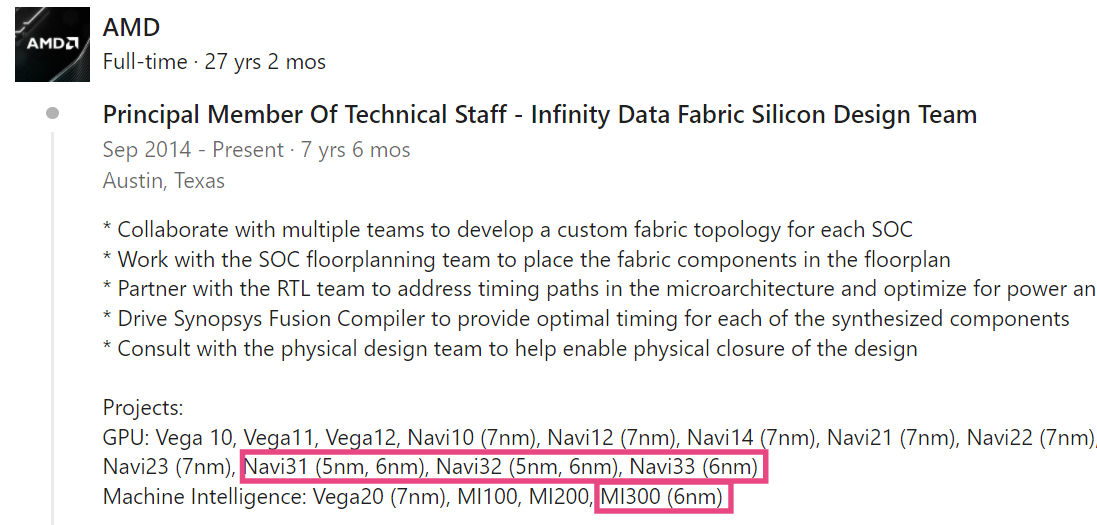 Один з інженерів AMD, який працював над шиною Infinity Fabric, підтвердив у своєму профілі LinkedIn, що графічні процесори Navi 3X будуть використовувати багаточипове компонування. У них компанія об'єднає кристали, що виготовляються за 6-нм та 5-нм технологіями TSMC.