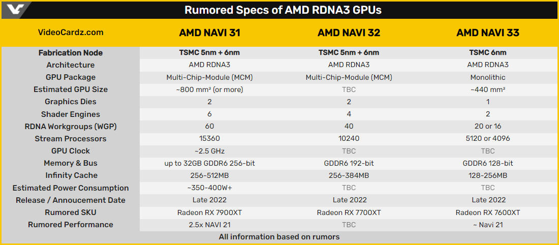 Сімейство графічних ядер AMD Navi 3X буде представлено як мінімум трьома GPU. У Navi 31 та Navi 32 компанія використає кілька окремих кристалів, тоді як молодший Navi 33 є монолітним чіпом. Офіційний анонс новинок має відбутися ближче до кінця цього року, а зустріти їх можна буде у відеокартах Radeon RX 7000-ї серії.