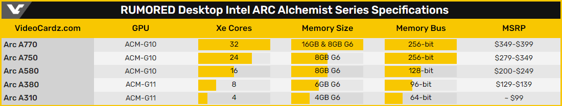 Флагманська відеокарта Intel Arc A770 має скласти конкуренцію моделям GeForce RTX 3060 Ti та Radeon RX 6650 XT. Вона буде запропонована у версіях з буфером GDDR6 об'ємом 8 та 16 Гбайт, а її рекомендована ціна (MSRP) складе від 349 до 399 доларів. Штатний показник TDP дорівнює 225 Вт.