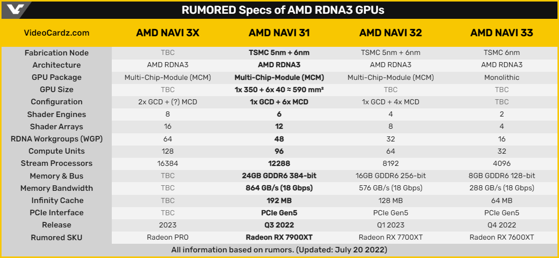 Згідно з останньою інформацією, площа кристала GCD становитиме 350 мм². Для порівняння, 7-нм графічний процесор AMD Navi 21 має площу 520 мм², а відеоядро Nvidia GA102 — 627 мм².