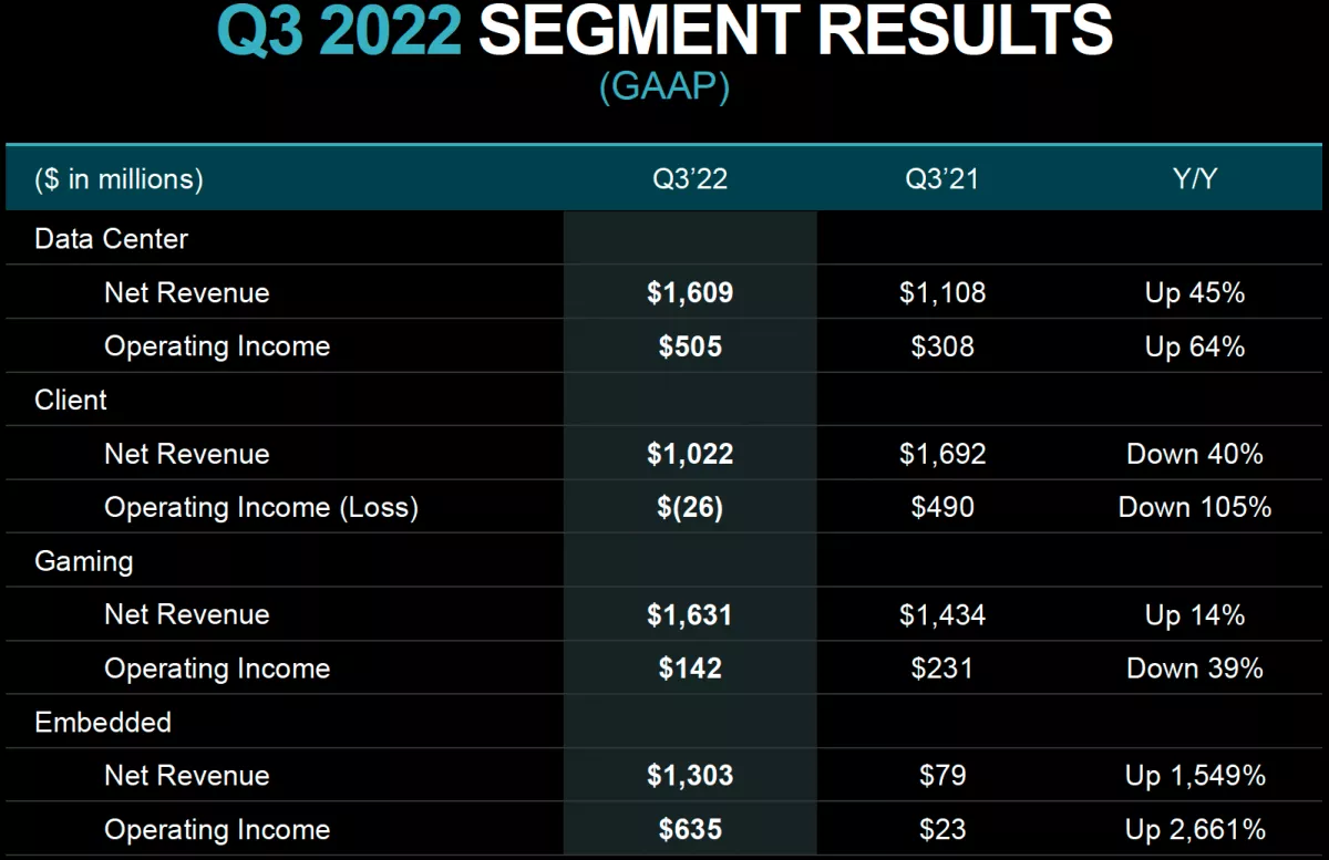 Як і головний конкурент, AMD у третьому кварталі зіткнулася зі зниженням попиту на процесори та набори логіки для персональних комп'ютерів. Виторг «червоних» у цьому сегменті склав трохи більше мільярда доларів, що на 40% менше минулорічних показників. У результаті відповідний підрозділ завершив квартал із $26 мільйонами операційних збитків.