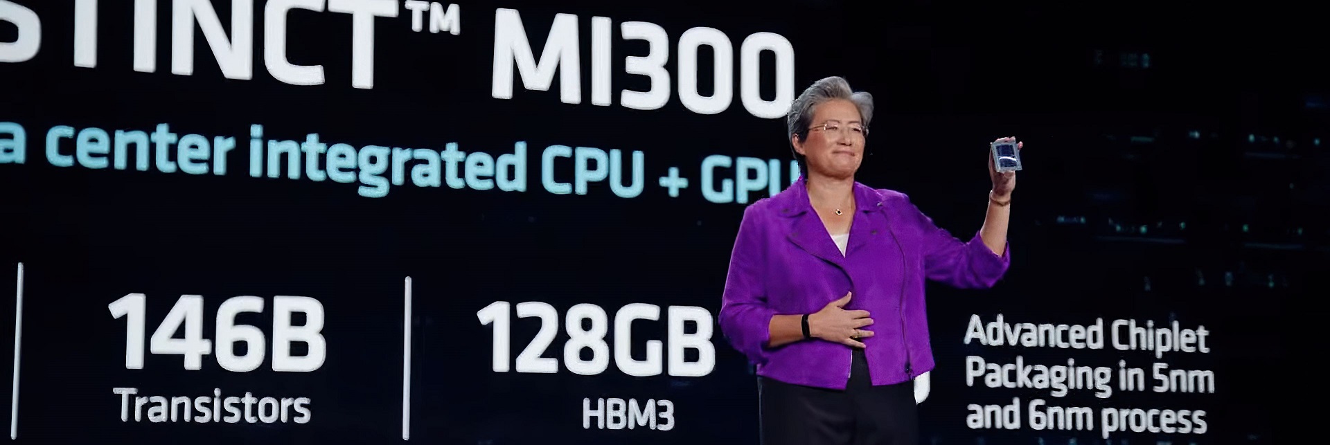 В Instinct MI300 компанія використала технологію тривимірного компонування, розмістивши дев'ять 5-нм чиплетів на чотирьох 6-нм кристалах. З обох боків цього «бутерброда» знаходяться стеки пам'яті HBM3 сумарним об'ємом 128 Гбайт. Відомо, що у розпорядженні Instinct MI300 буде 24 ядра Zen 4 та спеціалізовані ядра на архітектурі CDNA 3-го покоління.