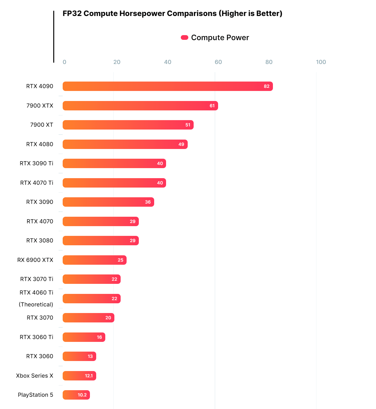 Це приблизно на 20% нижче за результати GeForce RTX 4070 Ti. А різниця між двома відеокартами за кількістю виконавчих блоків GPU дорівнює 24%.