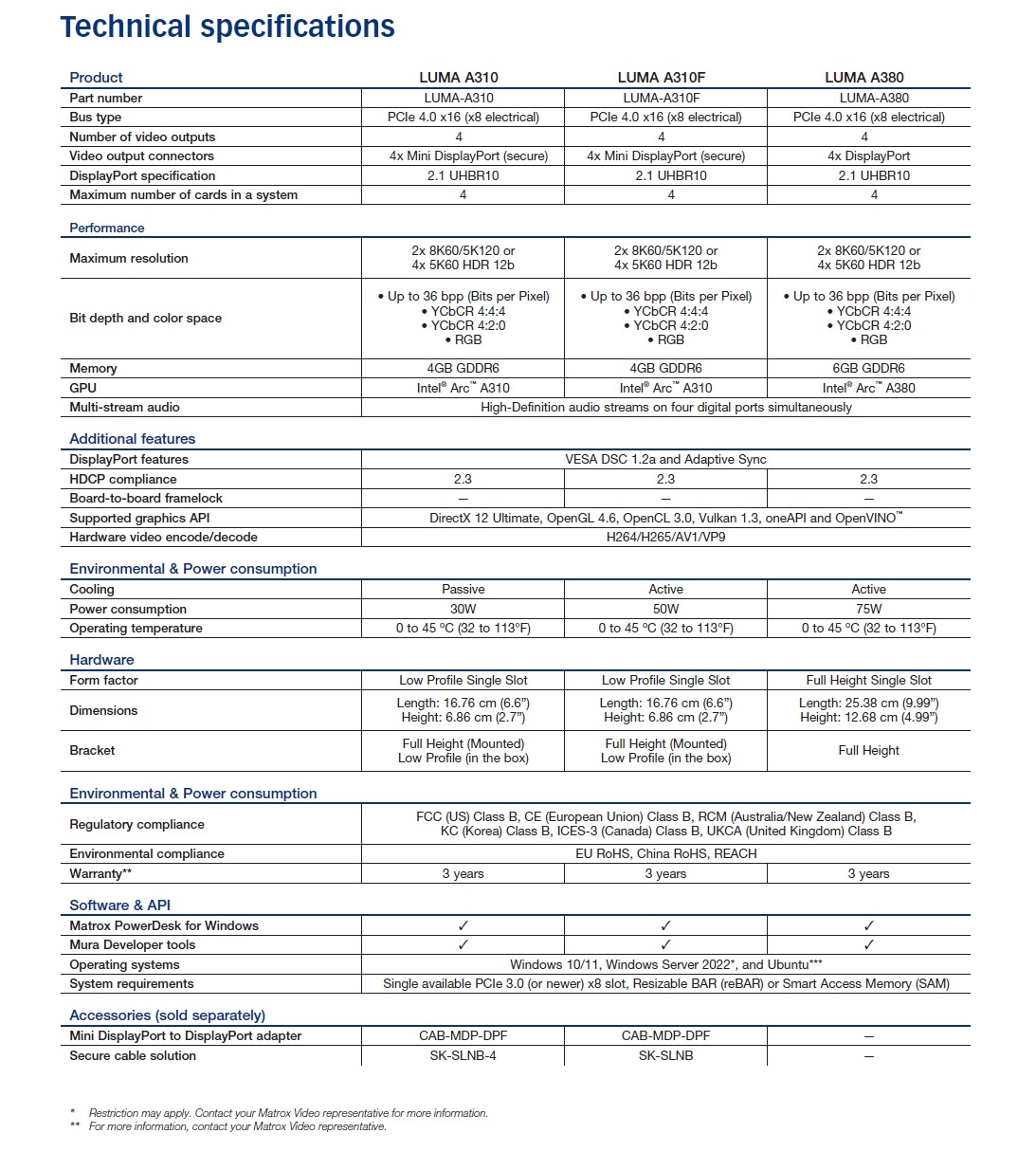 Основою вищезгаданих відеокарт Matrox, як неважко зрозуміти з назви, послужили Intel Arc A310 та A380. Моделі LUMA A310 та A310F примітні низькопрофільним виконанням, при цьому версія без суфікса «F» може похвалитися пасивною системою охолодження. Набір відеовиходів у всіх випадках представлений чотирма DisplayPort або MiniDisplayPort версії 2.1. Є підтримка 8K60-дисплеїв, щоправда, одночасне виведення зображення можливе лише на два таких пристрої. Детальні специфікації новинок наведені у таблиці нижче. Рекомендовані ціни оголошені не були.