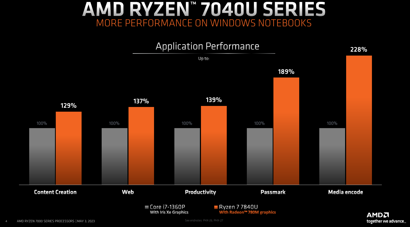 Сьогодні компанія AMD представила лінійку гібридних процесорів Ryzen 7040U. Вони належать до 4-нм сімейства Phoenix, тобто поєднують x86-ядра Zen 4 та графічний модуль RDNA 3-го покоління, а їх головною сферою застосування стануть тонкі та легкі ноутбуки.