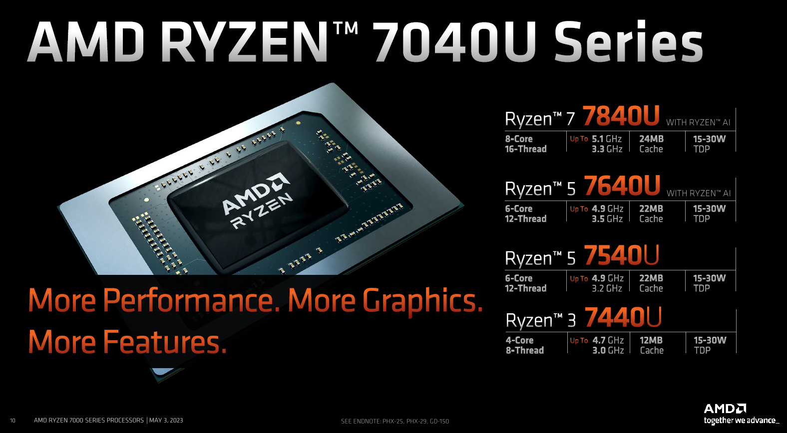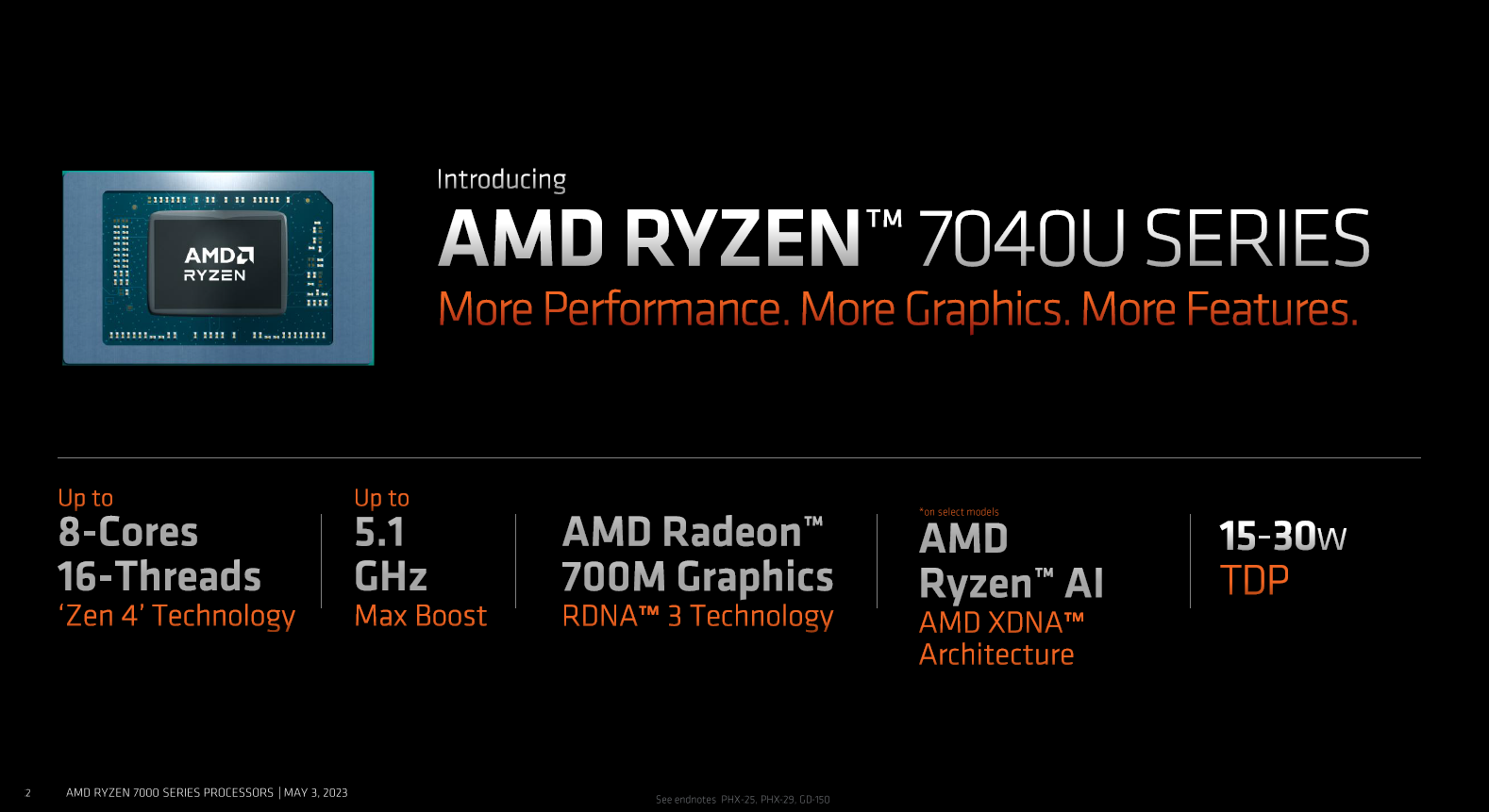 За характеристиками процесори AMD Ryzen 7040U близькі до чипів Ryzen 7040HS, анонсованим кілька місяців тому в ході CES 2023. У їх арсеналі є до восьми ядер Zen 4, до 16 Мбайт L3-кеша, контролер пам'яті DDR5/LPDDR5 та вбудована графіка RDNA 3-го покоління, яка нараховує до 12 Compute Units. Головна відмінність між U- та HS-чипами криється в робочих частотах та паспортному рівні TDP.