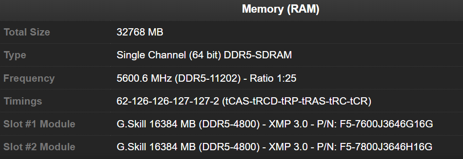 Ентузіасту вдалося «розкочегарити» пару 16-гігабайтних модулів G.Skill Trident Z5 RGB DDR5-7800 до ефективної частоти 11202 МГц. Для цього формулу затримок довелося послабити до 62-126-126-127-127, а також використати випарники рідкого азоту для охолодження процесора та оперативної пам'яті.