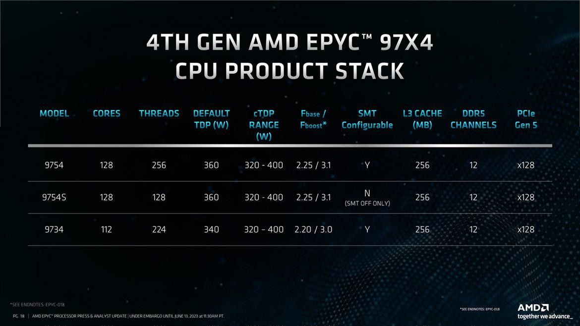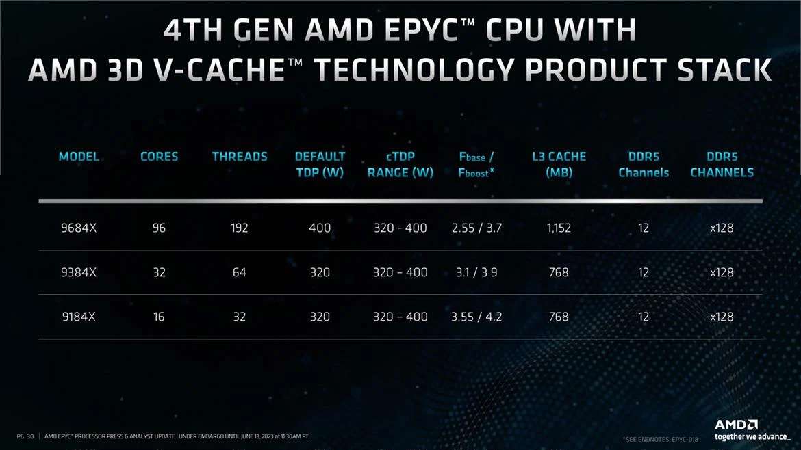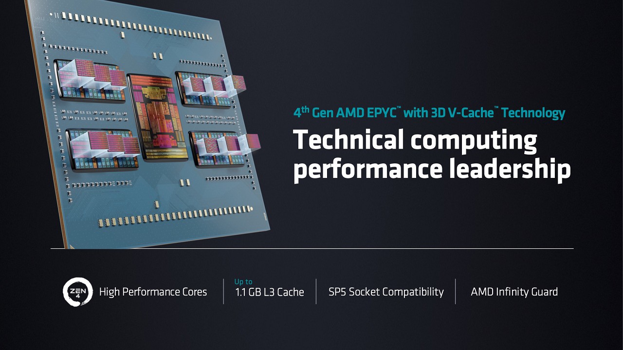 Серверні чипи EPYC Genoa-X близькі за характеристиками до звичайних EPYC Genoa. Вони теж базуються на архітектурі Zen 4, мають конструктивне виконання Socket SP5, 12-канальний контролер DDR5-4800 та 128 ліній інтерфейсу PCI Express 5.0. Однак на чиплетах з x86-ядрами у них розпаяно мікросхеми з додатковим L3-кешем, завдяки чому сумарний обсяг кеш-пам'яті третього рівня становить до 1152 Мбайт. Усього компанія підготувала три моделі, їх короткі специфікації наведені нижче.