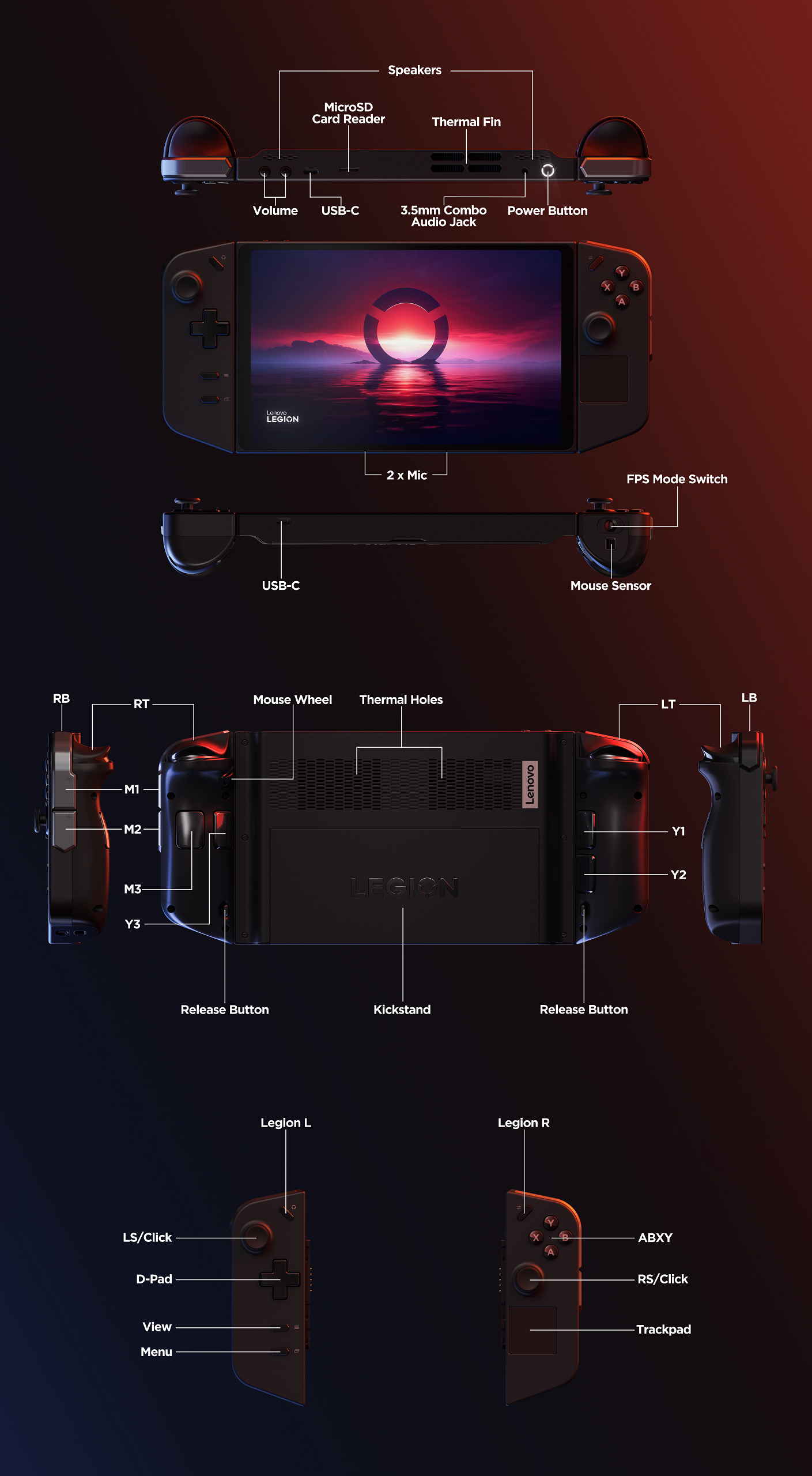 Основою Lenovo Legion Go послужив процесор AMD Ryzen Z1 Extreme. Цей «камінець» знайомий за ASUS ROG Ally, пропонує вісім ядер Zen 4 та графічний блок на 12 Compute Units з архітектурою RDNA 3-го покоління. Компанію процесору склали 16 Гбайт оперативної пам'яті LPDDR5X-7500, а також NVMe-накопичувач M.2 з інтерфейсом PCI-E 4.0 x4 місткістю 512 Гбайт. Загальні габарити пристрою становлять 299×131×41 мм при масі близько 854 грам.