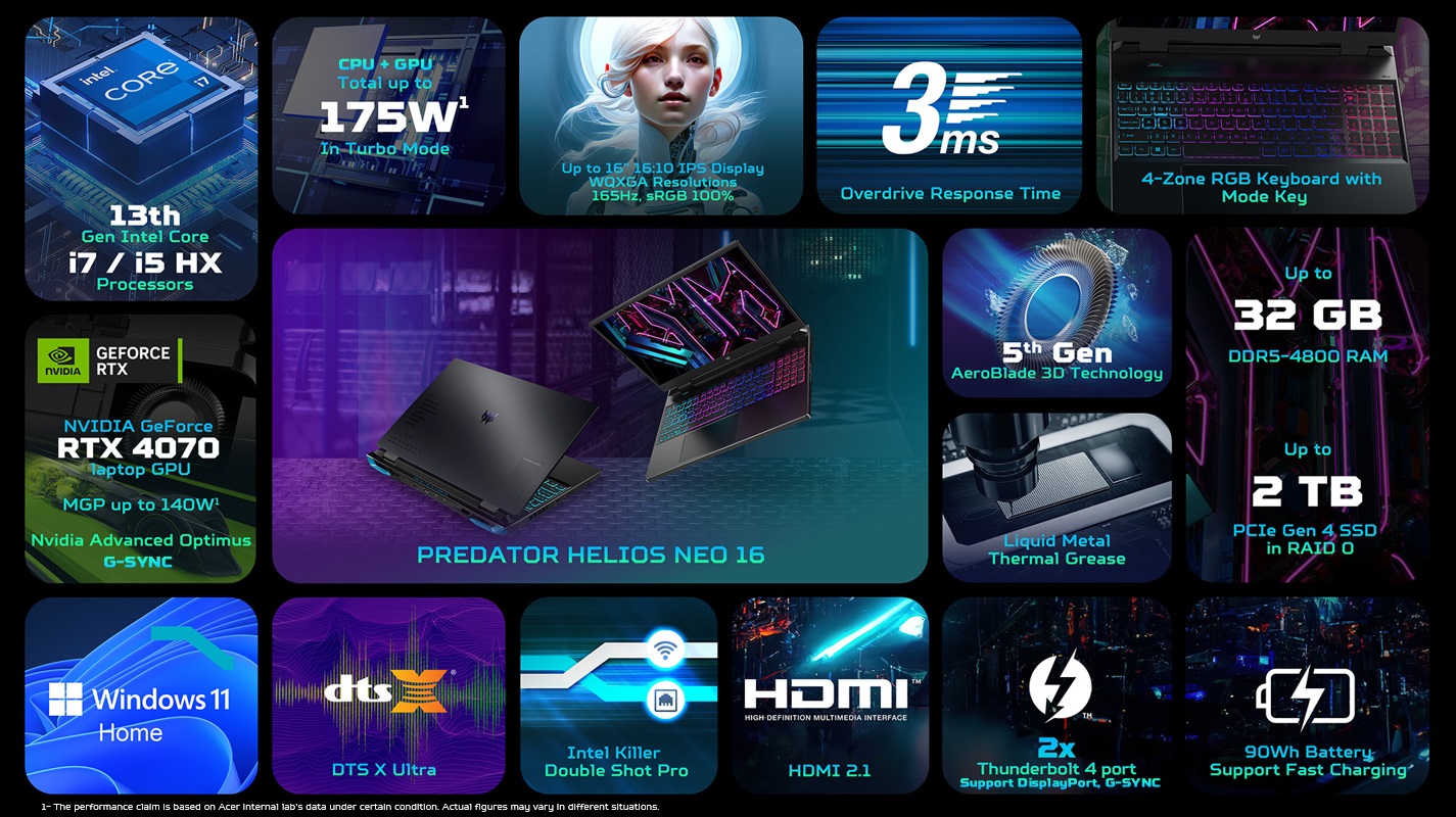 В українських магазинах доступні конфігурації Acer Predator Helios Neo 16 з процесором Core i7-13700HX (16 ядер/24 потоки) та відеоадаптером GeForce RTX 4060 Laptop або RTX 4070 Laptop. Обсяг оперативної пам'яті становить 16 або 32 ГБ, а у ролі сховища виступає SSD місткістю 512 ГБ або 1 ТБ. Роздільна здатність екрана становить 1920x1200 або 2560x1600 пікселів залежно від конфігурації, частота оновлення — 165 Гц.