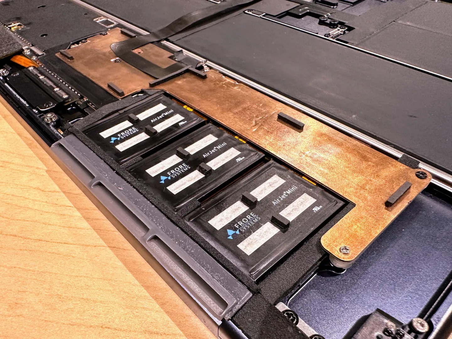Фахівці Frore Systems показали, як за допомогою трьох модулів AirJet Mini можна покращити температурний режим та продуктивність Apple M2. Кожен такий модуль здатний розсіювати 5,25 Вт теплової потужності та має товщину всього 2,8 мм. За створення повітряного потоку в них відповідає набір мембран, що вібрують з ультразвуковою частотою