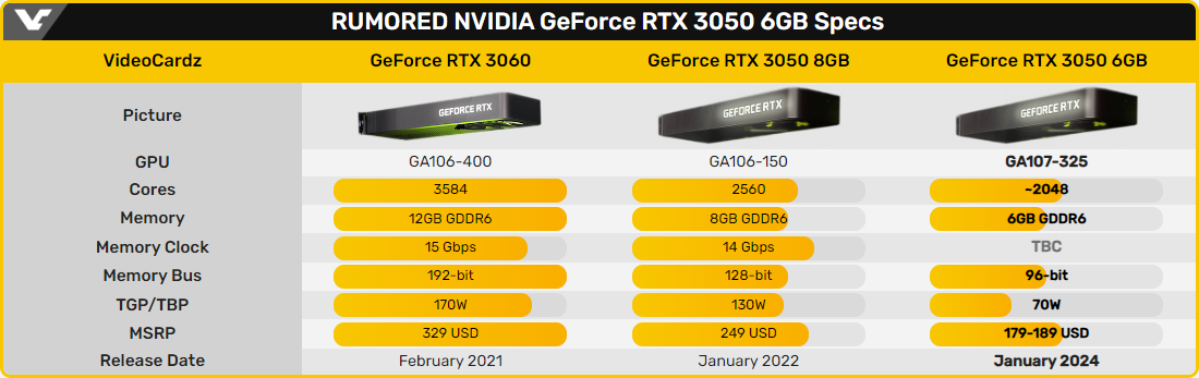 Від азійських джерел надходять нові подробиці про відеокарту GeForce RTX 3050 6GB, яка незабаром замінить оригінальну модель. До продажу новинка надійде наступного місяця. Цілком очікувано, що рекомендована ціна 6-гігабайтної GeForce RTX 3050 буде нижчою, ніж у модифікації з 8-ГБ відеобуфером. Вона складе близько 179-189 доларів, повідомляє веб-ресурс BenchLife, який тісно контактує з тайванськими AIB-партнерами Nvidia.