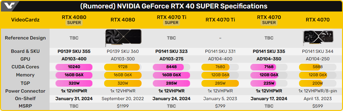 Якщо говорити про старт продажів, то GeForce RTX 4070 Super, RTX 4070 Ti Super та RTX 4080 Super стануть доступні для покупки відповідно 17, 24 та 31 січня. У всіх випадках за день до релізу з'являться перші огляди, щоправда, вони розповідатимуть про продуктивність відносно простих моделей за рекомендованою ціною (MSRP). Матеріали, присвячені «просунутим» модифікаціям, вийдуть одночасно зі стартом продажів.