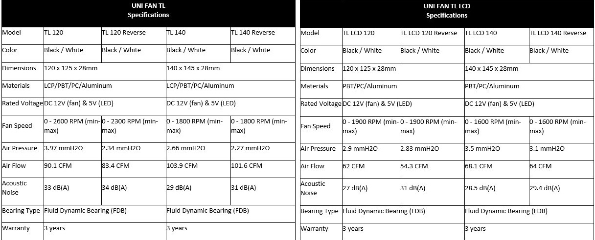 Всього Lian Li підготувала до релізу вісім моделей (по чотири 120- та 140-мм), кожна з яких доступна в чорному та білому кольорах. Окремо відзначимо наявність «вертушок» зі зворотним напрямком повітряного потоку. З технічними характеристиками вентиляторів можна ознайомитись нижче, всі вони супроводжуються трирічною гарантією виробника.