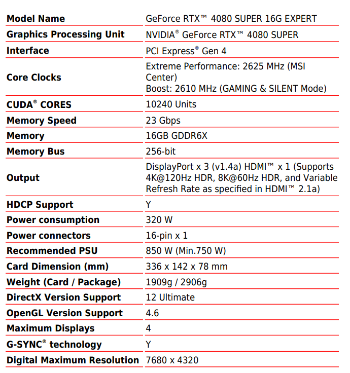 Тим часом до Мережі потрапили специфікації нової відеокарти. MSI GeForce RTX 4080 Super Expert отримає заводський розгін та «з коробки» працюватиме на boost-частоті 2610 МГц. Це на 60 МГц більше за еталонний показник. До того ж за допомогою утиліти MSI Center цей параметр можна буде збільшити до 2625 МГц. Паспортне енергоспоживання відеокарти складає 320 Вт, додаткове джерело живлення підключається через роз'єм 12VHPWR.