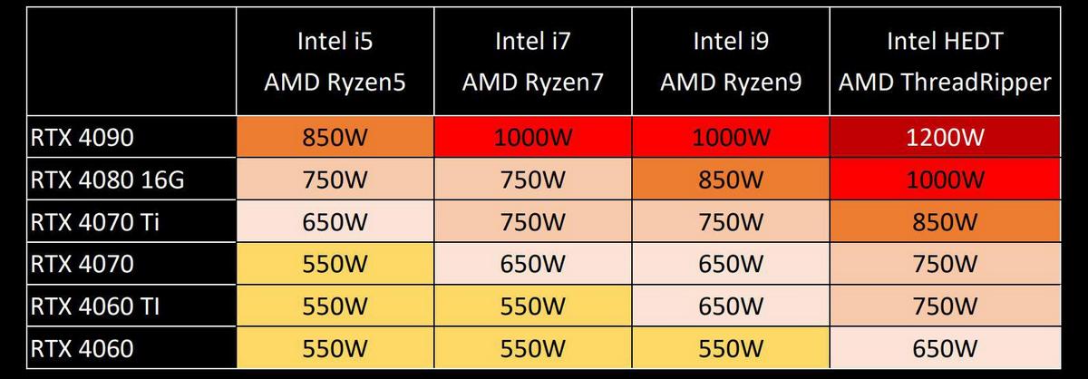 Якщо ви не впевнені, яка потужність знадобиться вашій наступній машині, в ASUS є зручна таблиця для графічних процесорів NVIDIA та AMD, яка підкаже, яка потужність знадобиться на основі наявного у вас обладнання. Отже, якщо у вас процесор Intel Core i5 і RTX 4080, рекомендовано обрати блок живлення потужністю 750 Вт, наприклад, TUF Gaming 750W Gold або ROG Strix 750W Gold Aura Edition. Якщо після цього ви перейдете на i9 з RTX 4090, то вам потрібно буде відповідно збільшити потужність блоку живлення — до 1000 Вт.