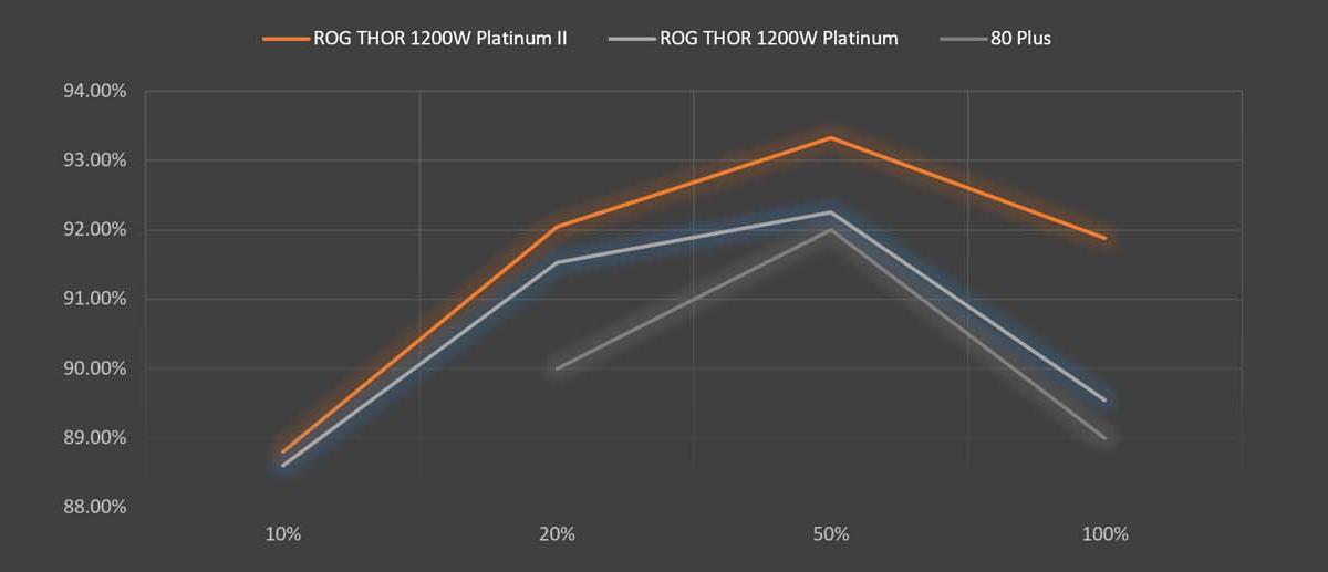 На щастя, усі сучасні блоки живлення ROG і TUF Gaming мають сертифікацію 80 Plus Gold або вище, що означає, що при 50% навантаженні вони можуть перетворити 90% змінного струму від мережі в постійний струм для вашого комп'ютера. Блоки живлення преміумкласу, такі як Thor 1000W Platinum II або Thor 1600W Titanium можуть похвалитися ще більшою ефективністю роботи.