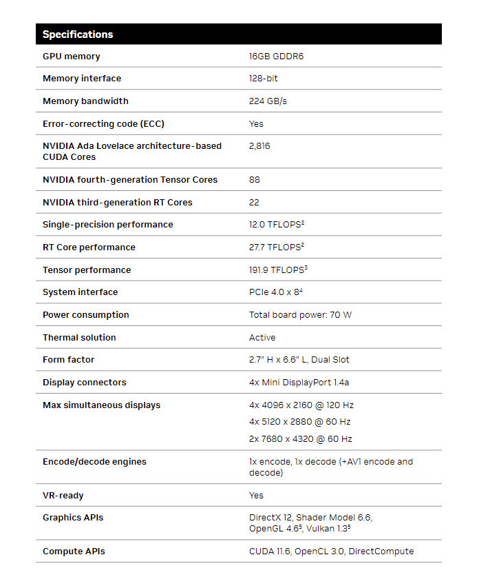 Охолодження відеокарти забезпечує невелика «турбіна». Енергоспоживання новинки не перевищує 70 Вт, завдяки чому вона обходиться без додаткового роз'єму живлення. У ролі інтерфейсу підключення виступають вісім ліній PCI Express 4.0, а для виведення зображення можна скористатися чотирма Mini DisplayPort 1.4a.