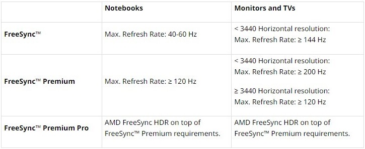 Тепер для проходження базової сертифікації AMD FreeSync монітори або телевізори з роздільною здатністю по горизонталі менше ніж 3440 пікселів повинні мати максимальну частоту оновлення понад 144 Гц. Це, наприклад, стосується пристроїв з роздільною здатністю 1920×1080, 2560×1080 та 2560×1440 пікселів.